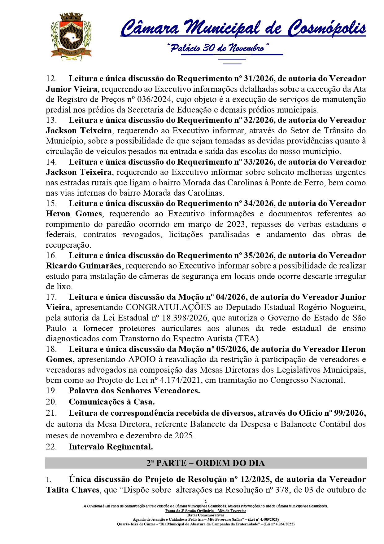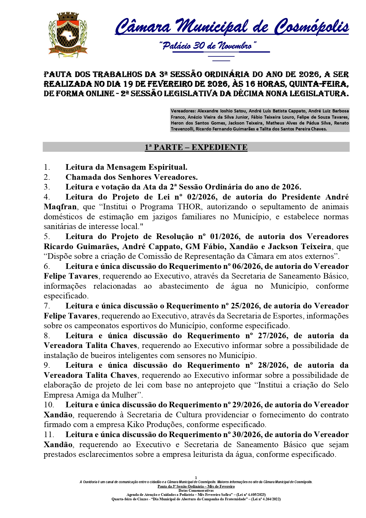 A Câmara Municipal de Cosmópolis realiza, nesta quinta-feira (19), a 3ª Sessão Ordinária de 2026. A reunião acontece a partir das 16h, de forma remota, com transmissão ao vivo pelo site camaracosmopolis.sp.gov.br/.