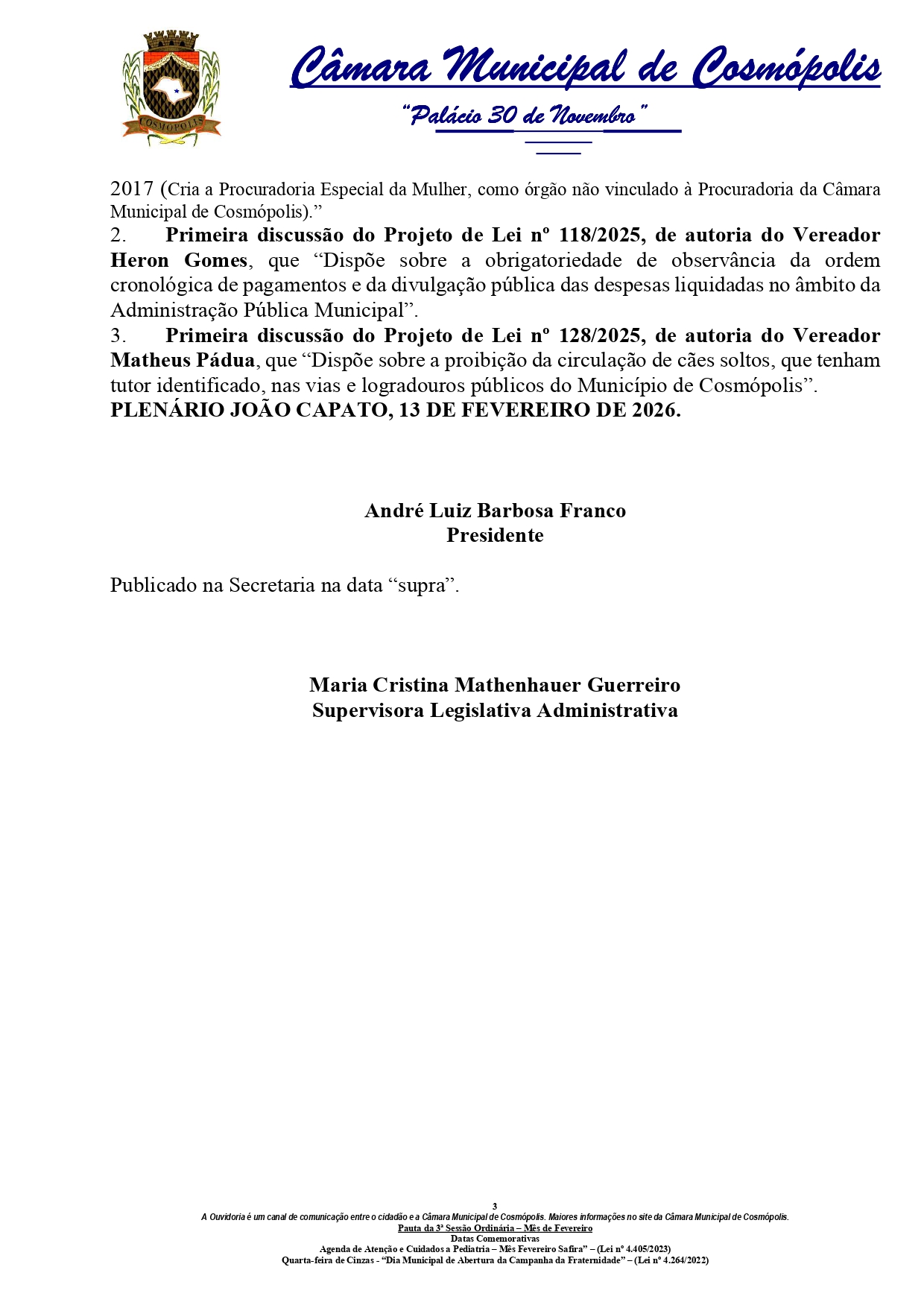 Câmara de Cosmópolis realiza 3° Sessão Ordinária de 2026