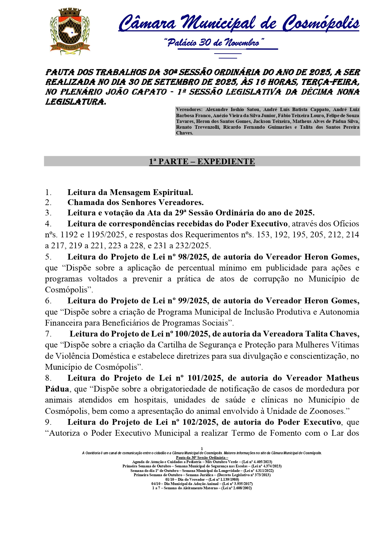 Entre os assuntos em pauta estão projetos de lei que tratam de diferentes áreas, como a aplicação de percentual mínimo em publicidade para ações de prevenção à corrupção, a criação de um programa municipal de inclusão produtiva para beneficiários de programas sociais e a elaboração de uma cartilha de segurança para mulheres vítimas de violência doméstica.
