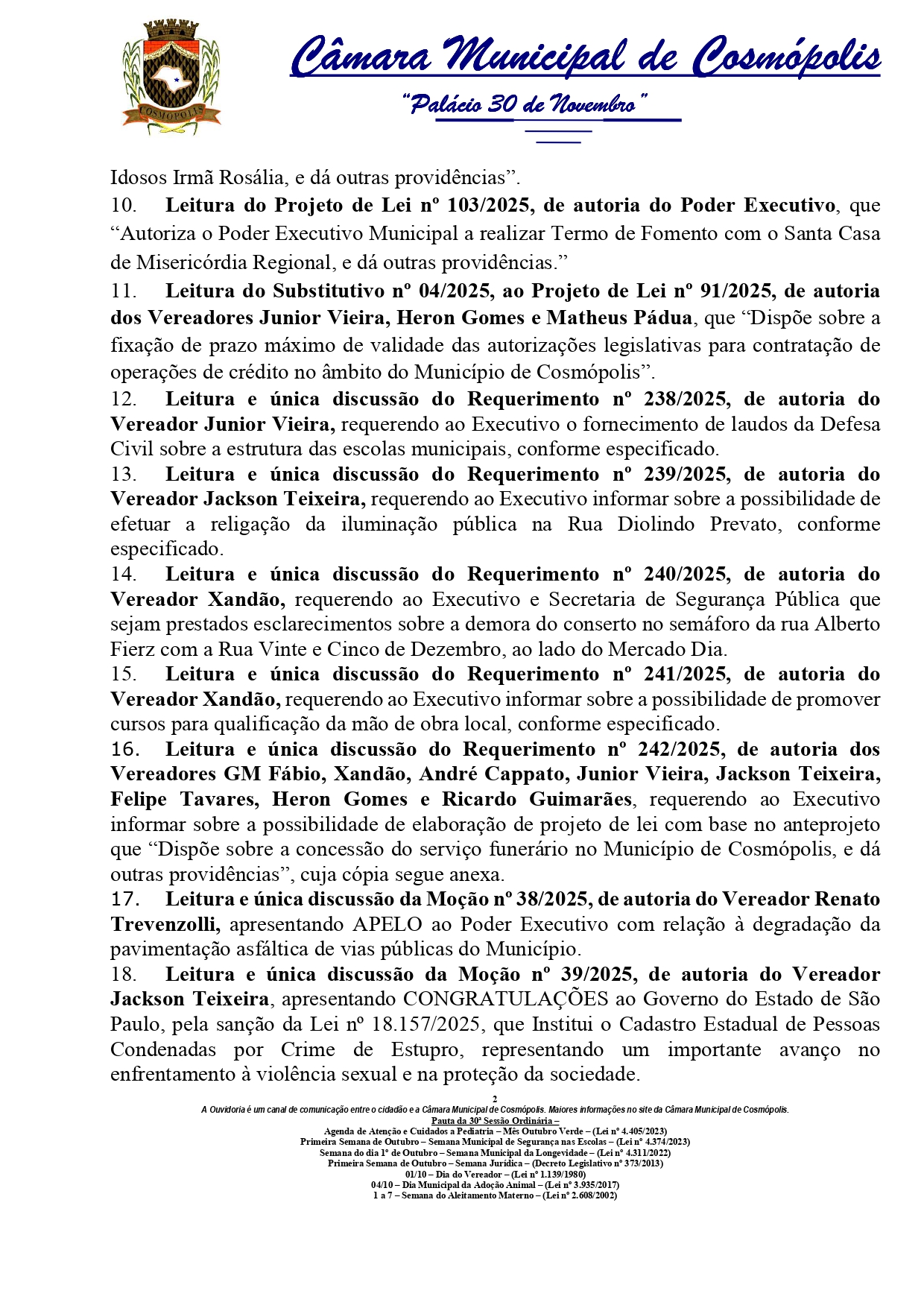 A sessão ainda contará com requerimentos relacionados à estrutura das escolas municipais, à manutenção da iluminação pública e à qualificação da mão de obra local, bem como uma moção de apelo sobre a pavimentação das vias públicas. Outro destaque é a análise de proposta referente à concessão do serviço funerário no município. Além disso, os vereadores apreciarão moções de congratulação e pesar, e indicações ligadas ao trânsito e à segurança pública.