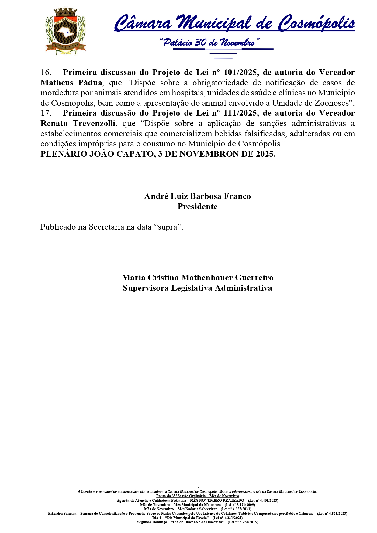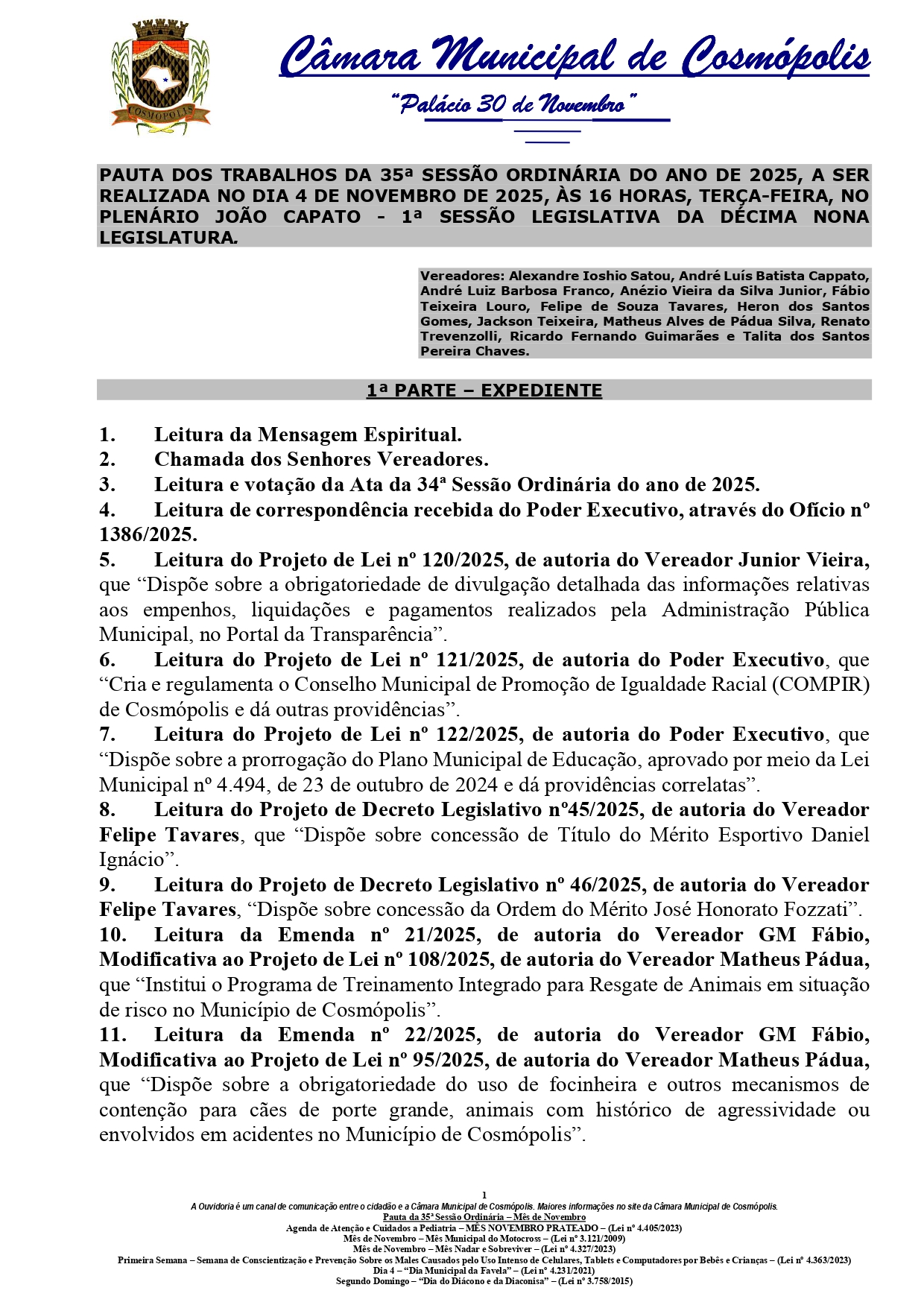 A Câmara de Cosmópolis realiza nesta terça-feira (04) a 35ª Sessão Ordinária de 2025. O encontro dos vereadores começa às 16h, no Plenário João Capato, e é aberto ao público. Durante a reunião, os vereadores discutirão projetos de lei, requerimentos e moções.
