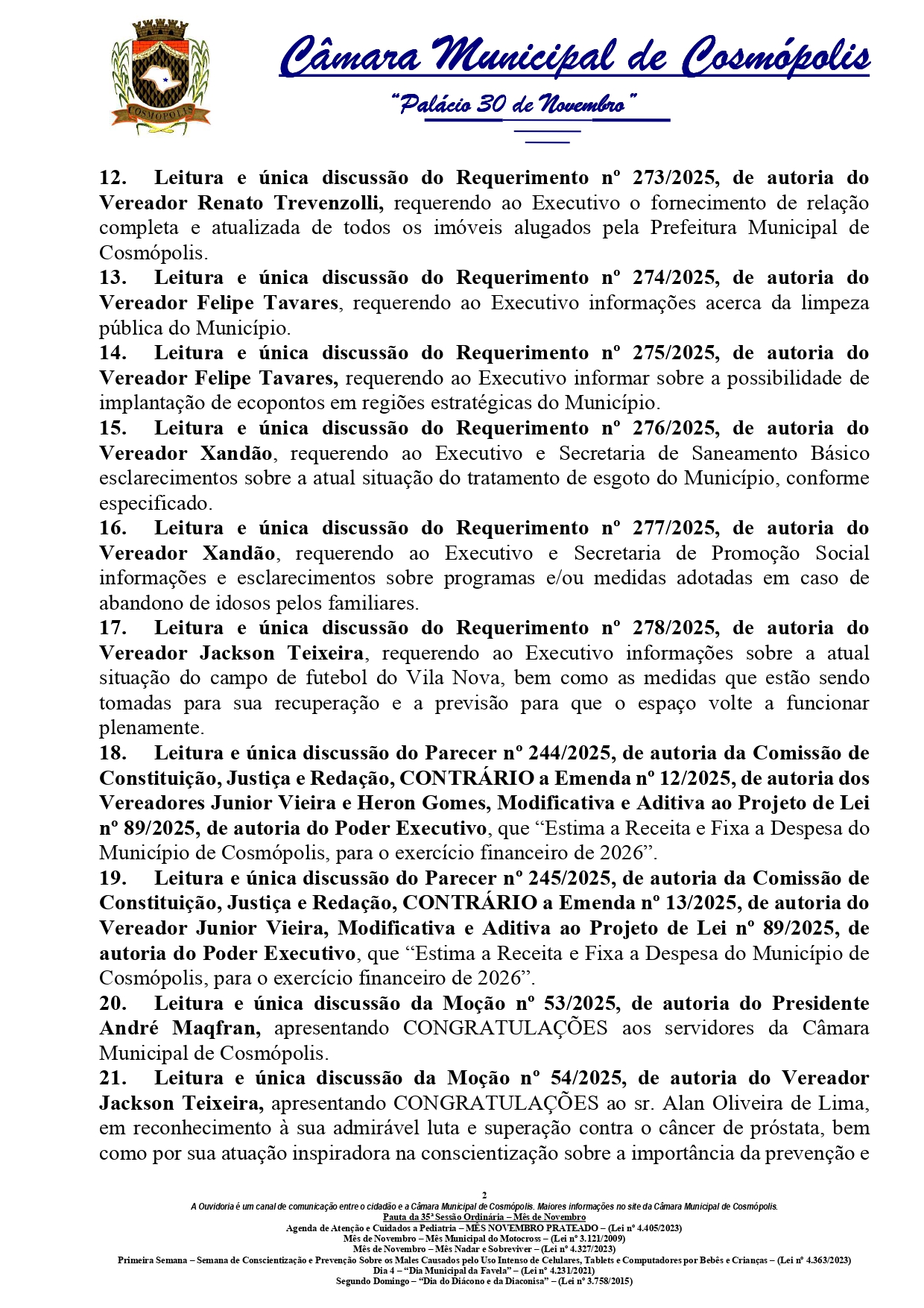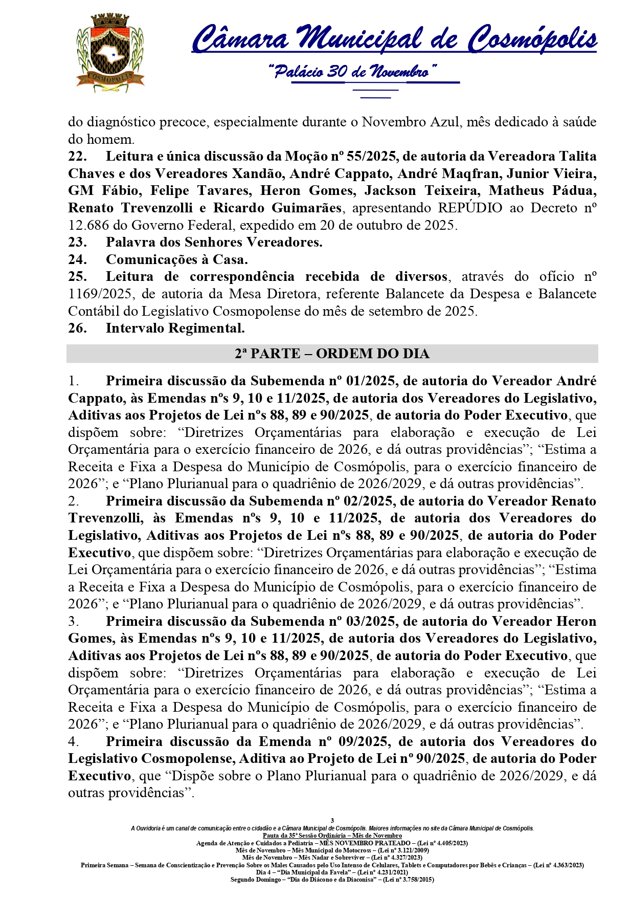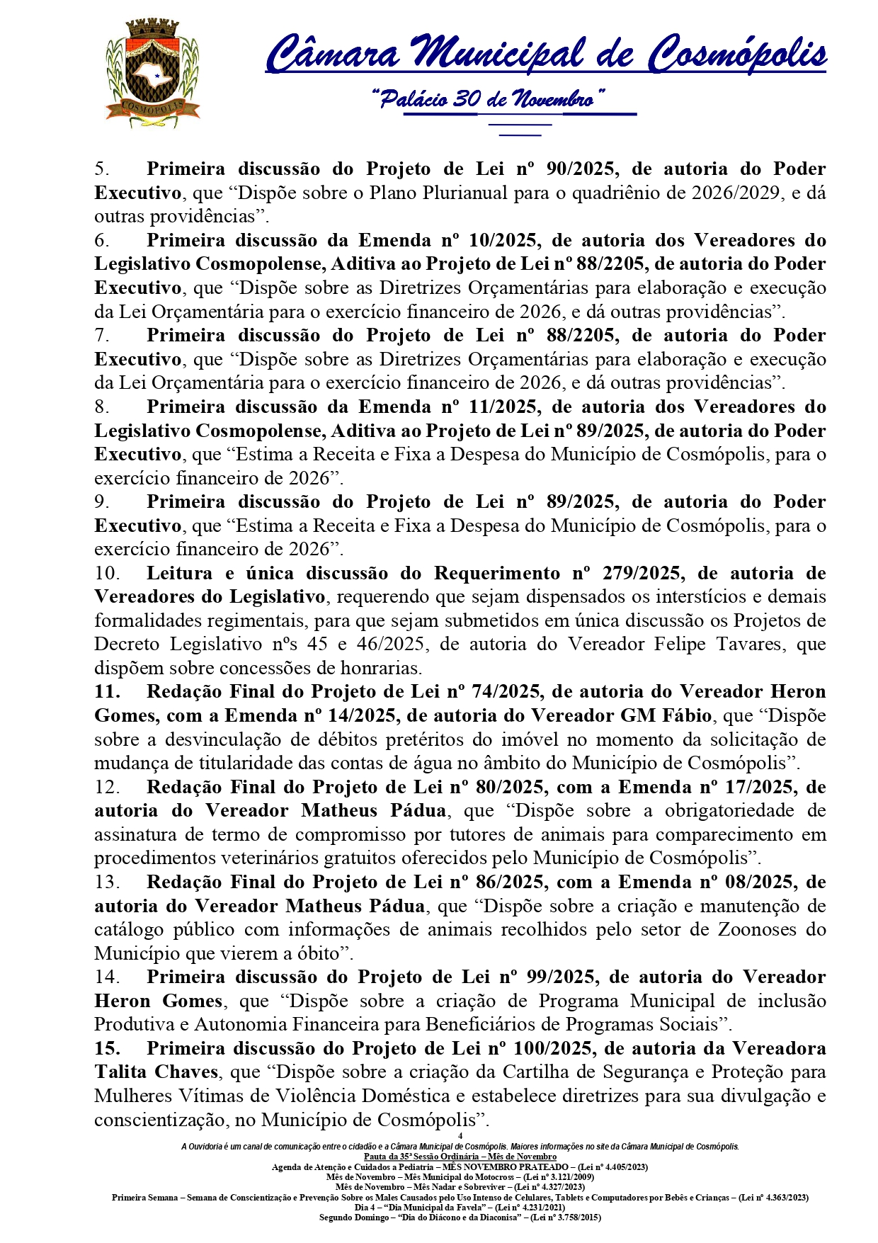 A pauta inclui a leitura e discussão de diversos projetos, requerimentos, emendas e moções. Entre os principais temas estão a criação do Conselho Municipal de Promoção da Igualdade Racial, a prorrogação do Plano Municipal de Educação e propostas de transparência sobre gastos públicos.