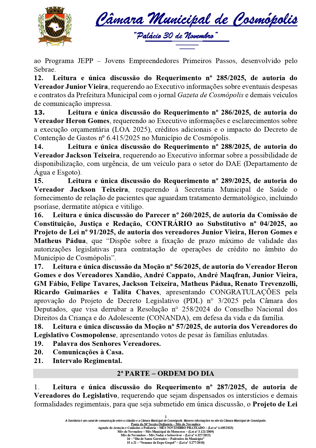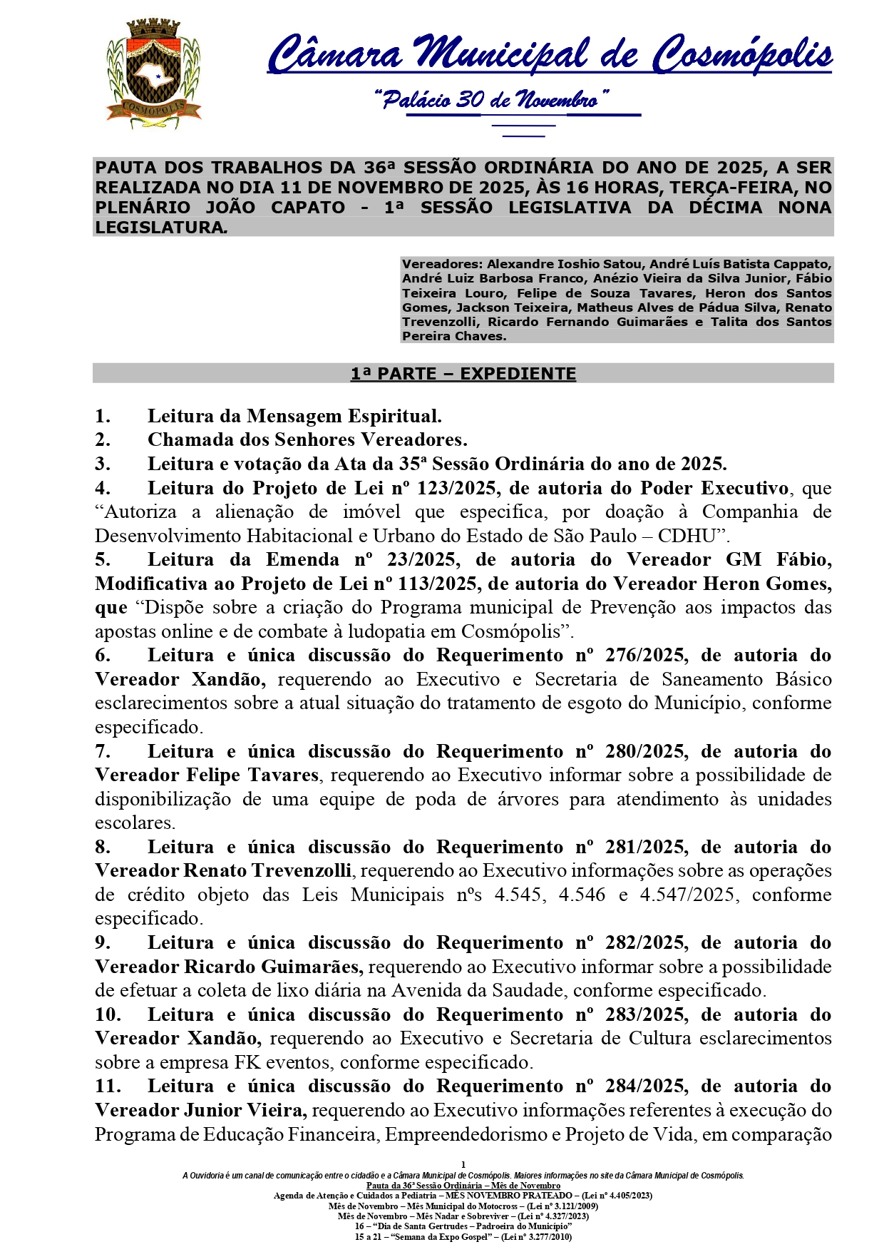 Em destaque, está o projeto de lei, de autoria do Poder Executivo, que autoriza a doação de imóvel à Companhia de Desenvolvimento Habitacional e Urbano do Estado de São Paulo (CDHU). Além disso, serão apresentados diversos requerimentos de informações ao Executivo, solicitando esclarecimentos sobre temas como tratamento de esgoto no município, poda de árvores em unidades escolares, operações de crédito aprovadas em leis municipais recentes, coleta de lixo diária na Avenida da Saudade, contratos e despesas com veículos de comunicação, além da execução de programas educacionais voltados à educação financeira e empreendedorismo.