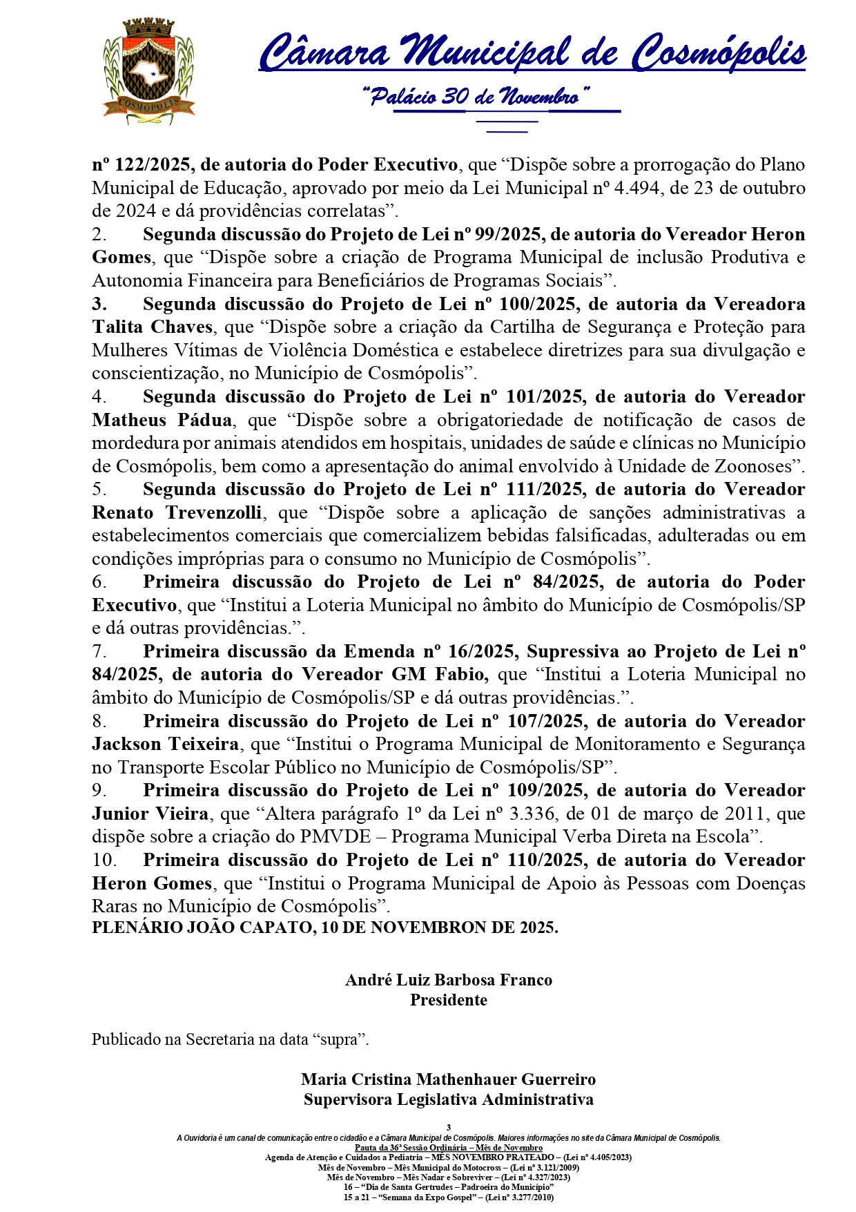 A Câmara de Cosmópolis realiza nesta terça-feira (11) a 36ª Sessão Ordinária de 2025. O encontro dos vereadores começa às 16h, no Plenário João Capato, e é aberto ao público. Durante a reunião, os vereadores discutirão projetos, requerimentos, emendas e moções voltadas à gestão pública, educação, meio ambiente e transparência administrativa.