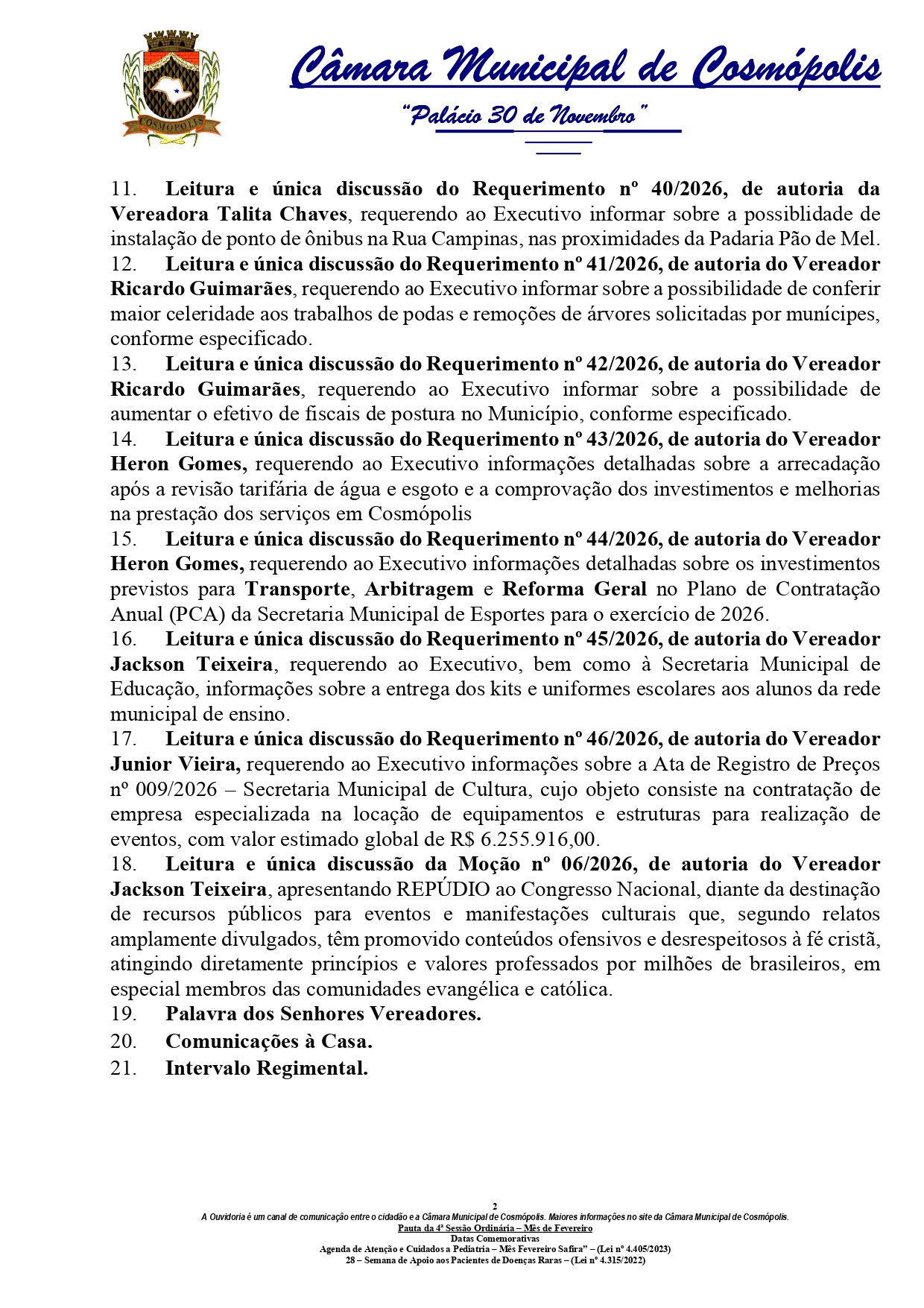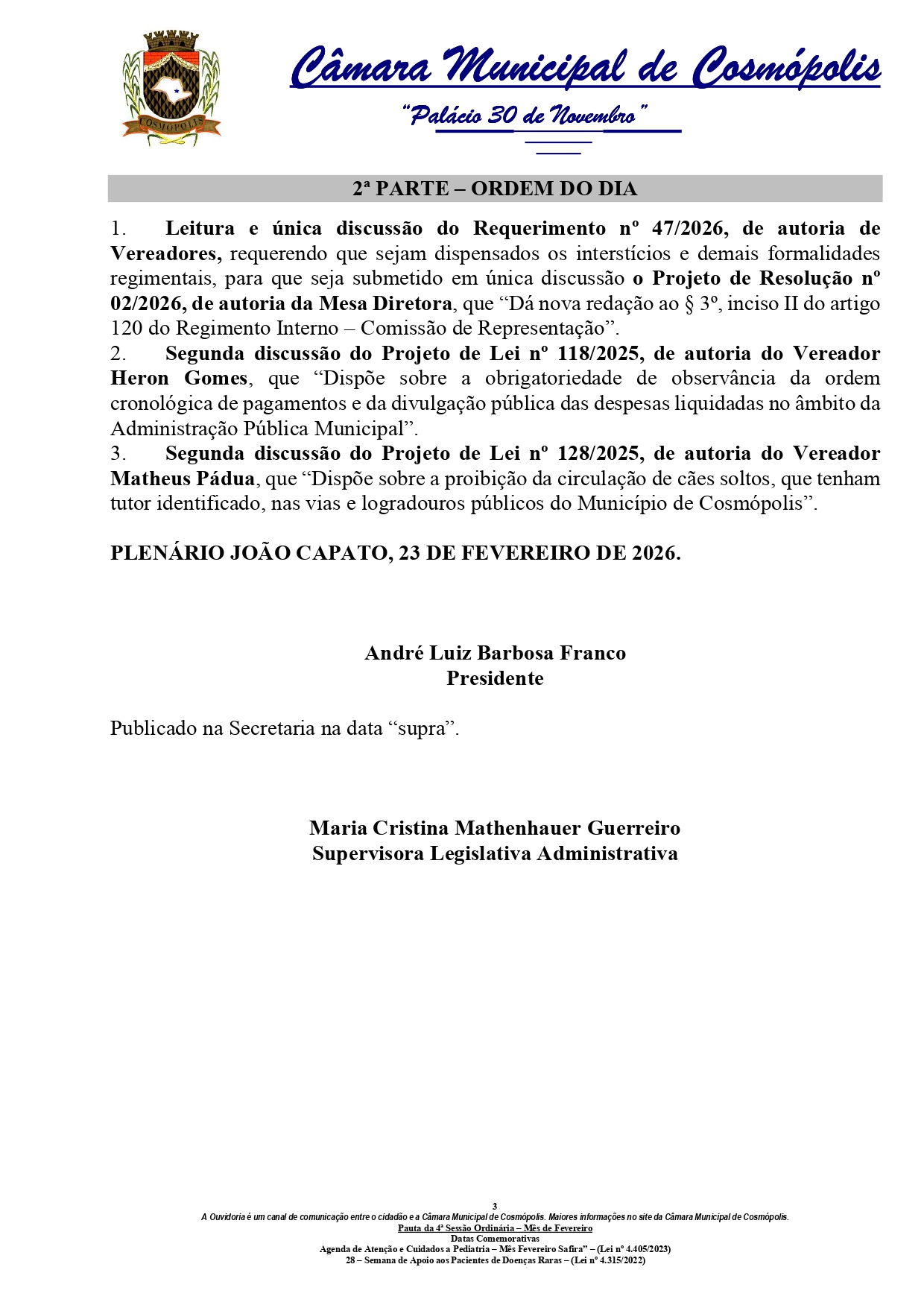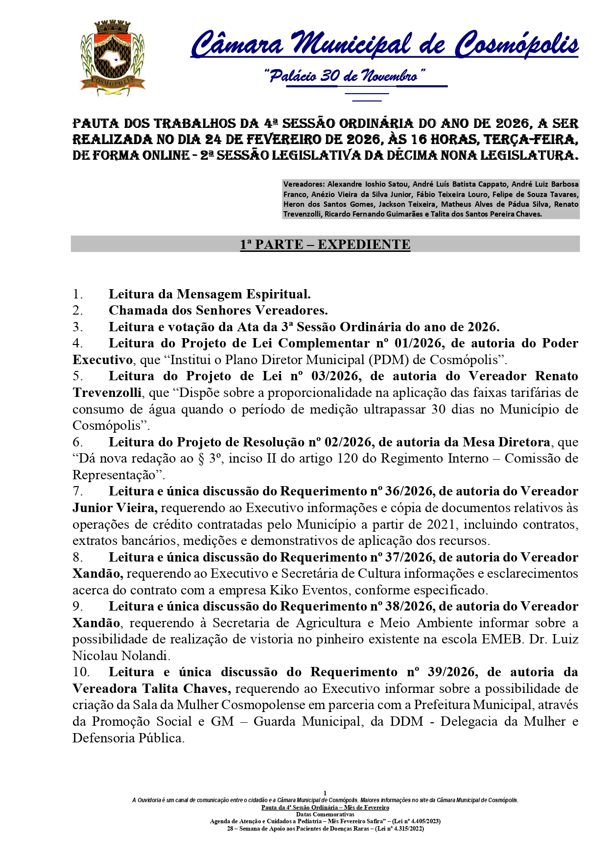 A Câmara Municipal de Cosmópolis realiza, nesta terça-feira (24), a 4ª Sessão Ordinária de 2026. A reunião dos vereadores está marcada para as 16h e ocorrerá em formato on-line, com transmissão ao vivo pelo site camaracosmopolis.sp.gov.br/.