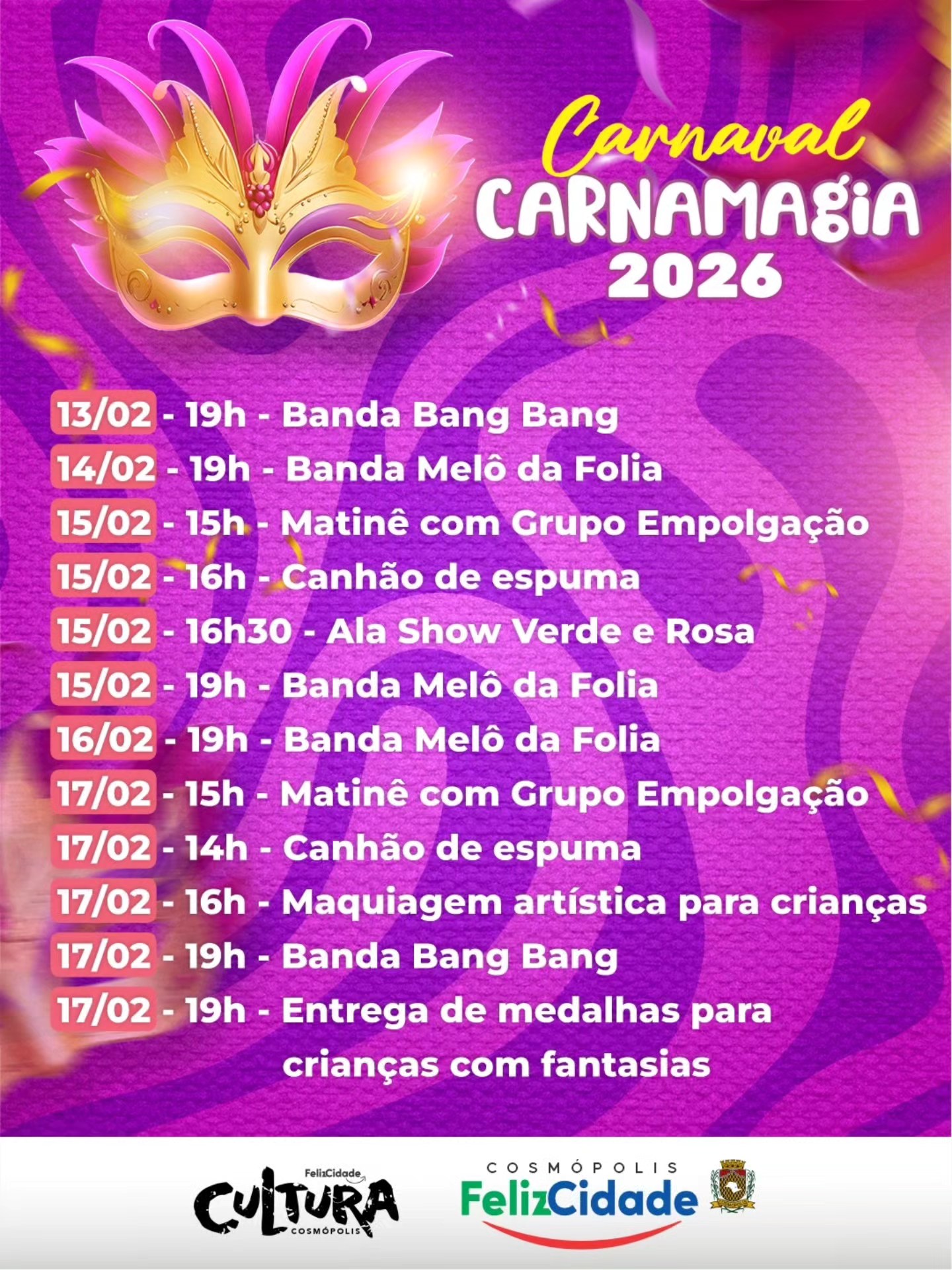 O Carnamagia 2026 começa nesta sexta-feira (13) em Cosmópolis. O evento gratuito será realizado a partir das 19h, na Praça do Rodrigo, com programação até a próxima terça-feira (17).