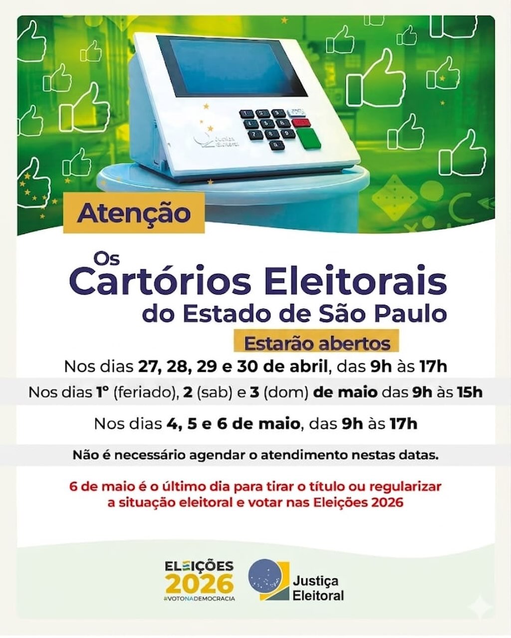 O Cartório Eleitoral de Cosmópolis terá horário especial de atendimento nos próximos dias para eleitores que precisam regularizar o título, emitir a primeira via, atualizar dados cadastrais ou realizar o cadastro biométrico para participar das Eleições 2026.