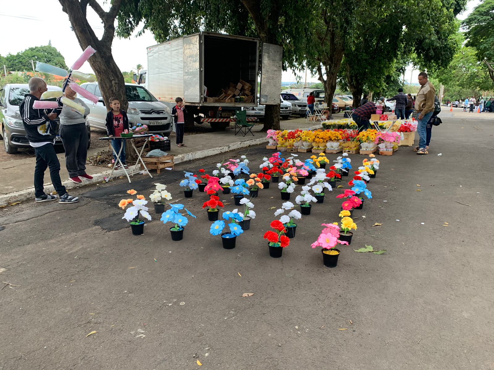 Como de costume, em frente ao Cemitério, está ocorrendo a venda de flores e velas e comerciantes do município instalaram barracas para venda de comidas e bebidas.
