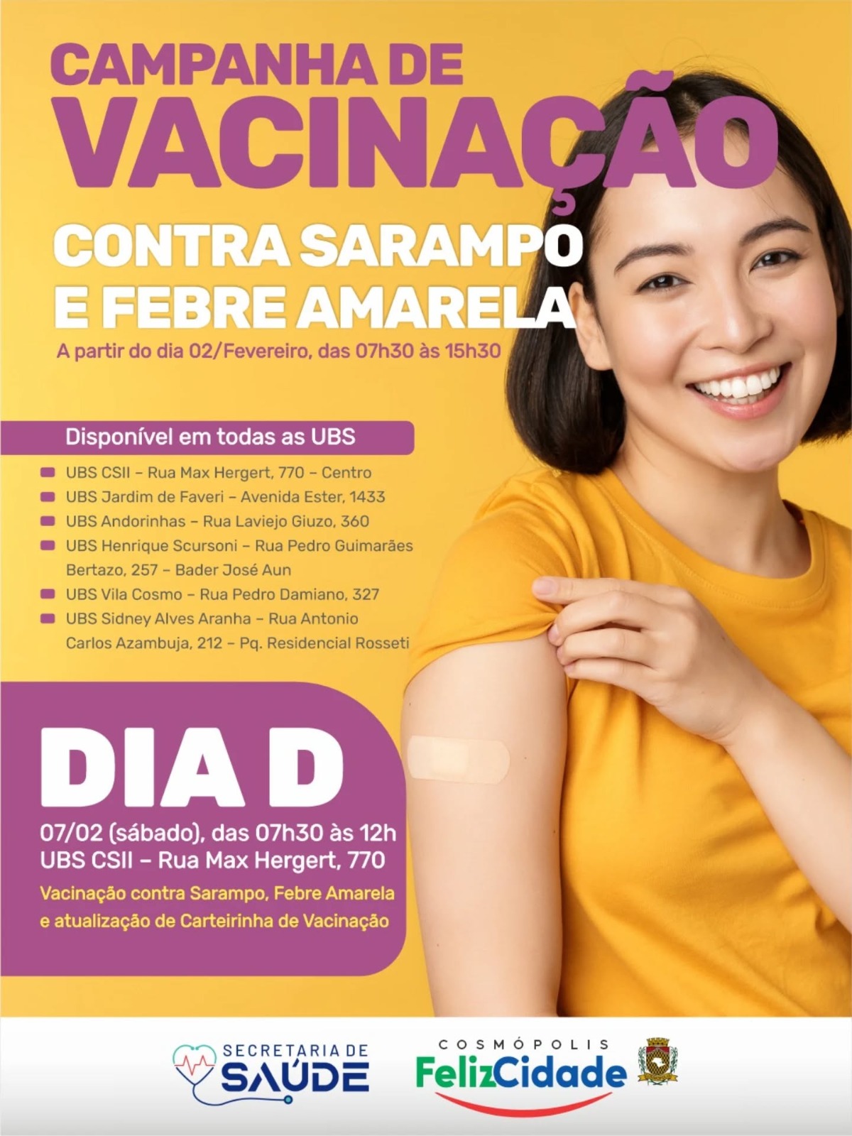 Cosmópolis inicia, nesta segunda-feira (02), a Campanha de Vacinação do Ministério de Saúde contra o Sarampo e a Febre Amarela. De acordo com a Prefeitura Municipal, a campanha estará disponível em todas as Unidades Básicas de Saúde, com sala de vacinação, de segunda a sexta-feira, das 7h30 às 15h30.