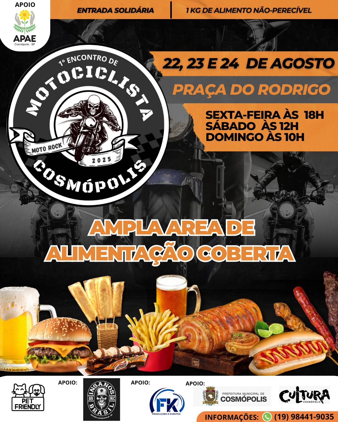Cosmópolis sediará, entre os dias 22 e 24 de agosto, o 1º Encontro de Motociclistas, na Praça do Rodrigo. O evento terá shows de rock diários, espaço gastronômico coberto, expositores de motos e produtos especializados.