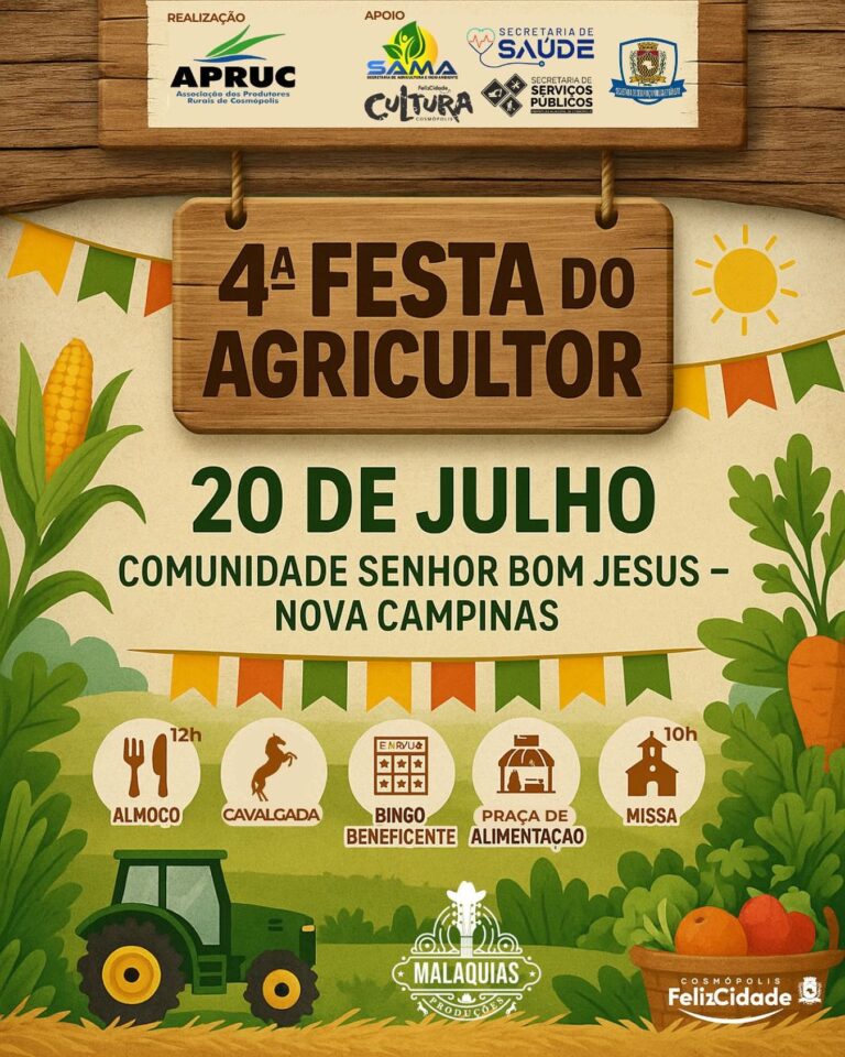 A Prefeitura de Cosmópolis, por meio da Secretaria de Agricultura e Meio Ambiente (SAMA), em parceria com a Associação dos Produtores Rurais de Cosmópolis (APRUC), anunciou a realização da 4ª Festa do Agricultor e da 2ª Cavalgada.