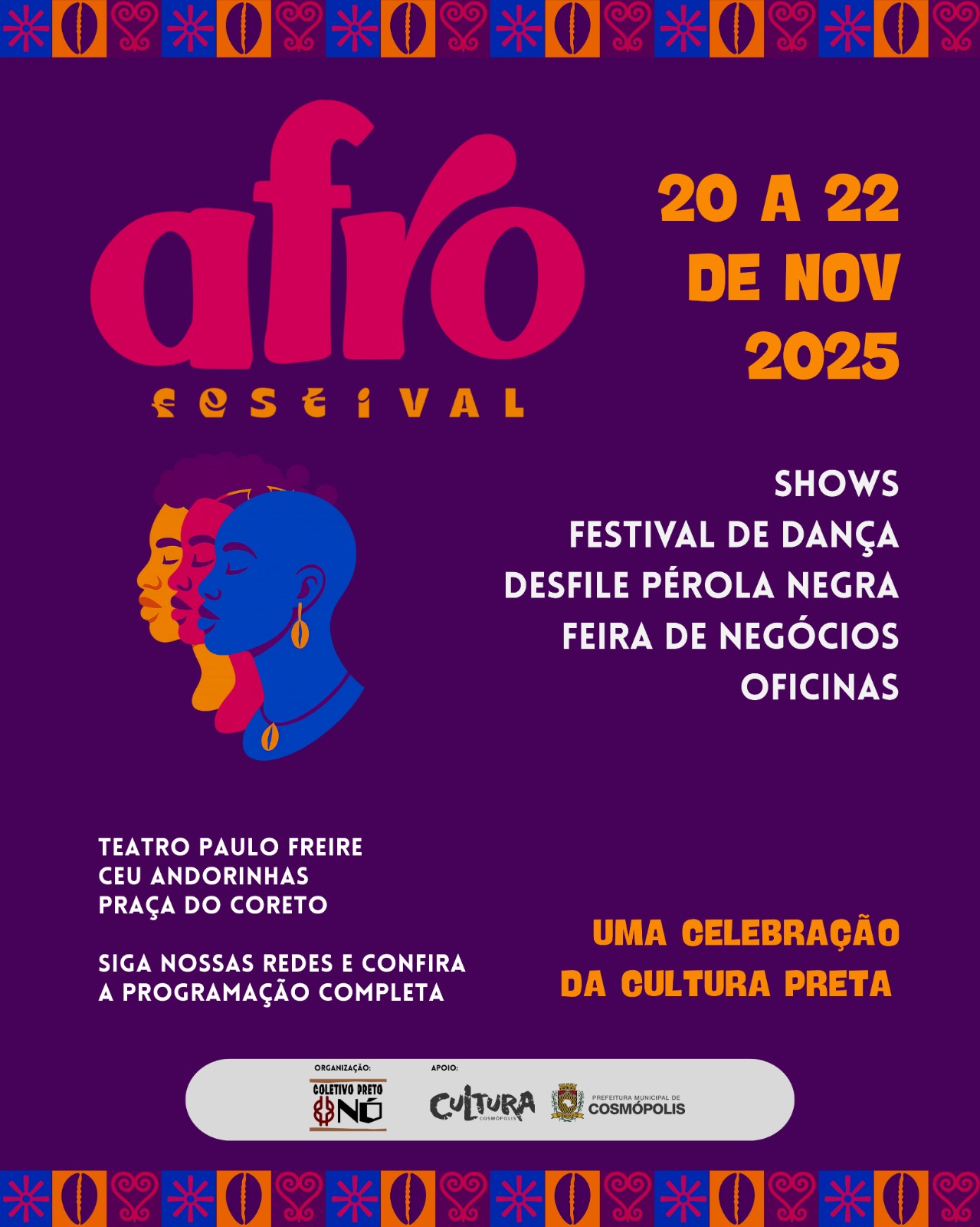 Entre os dias 20 e 22 de novembro, Cosmópolis será palco do Afro Festival, iniciativa que tem como objetivo fomentar e celebrar a cultura preta no município. O evento gratuito contará com oficinas, feira de negócios, festival de dança, apresentações musicais, mostra de curtas e o Desfile Pérola Negra. As atividades acontecem em diferentes locais da cidade, como o Auditório da Escola Paulo Freire, o CEU Andorinhas e a Praça do Coreto.