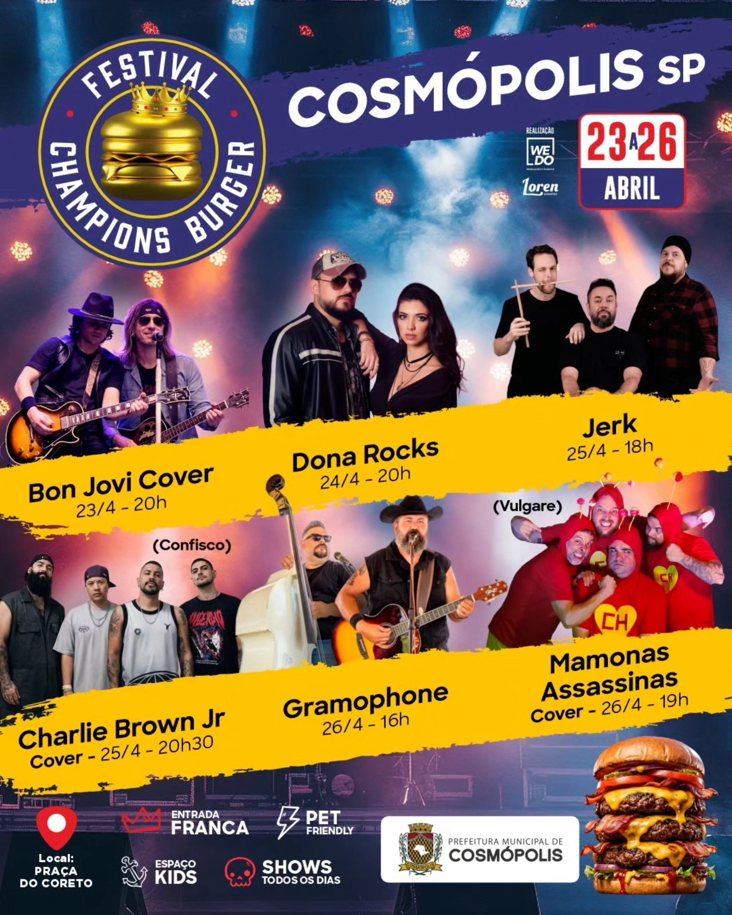 Cosmópolis recebe, entre os dias 23 e 26 de abril, o Festival Champions Burger, evento gastronômico e musical que será realizado na Praça do Coreto, com entrada gratuita. A programação reúne opções de hambúrgueres artesanais, atrações musicais e área kids.