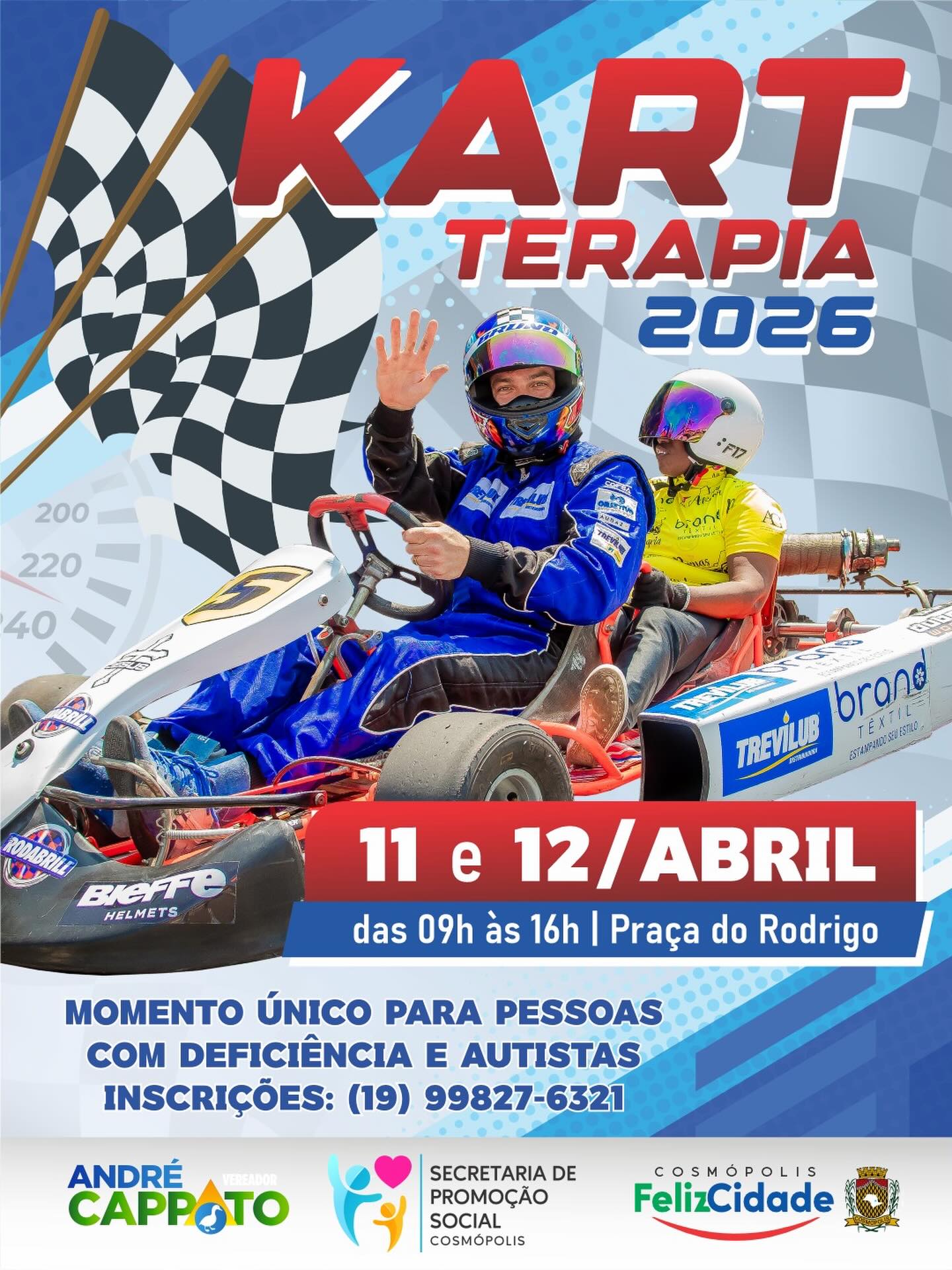 Cosmópolis recebe, nos dias 11 e 12 de abril, o projeto “Kart Terapia”, iniciativa voltada à inclusão de pessoas com autismo e deficiência por meio do automobilismo adaptado.