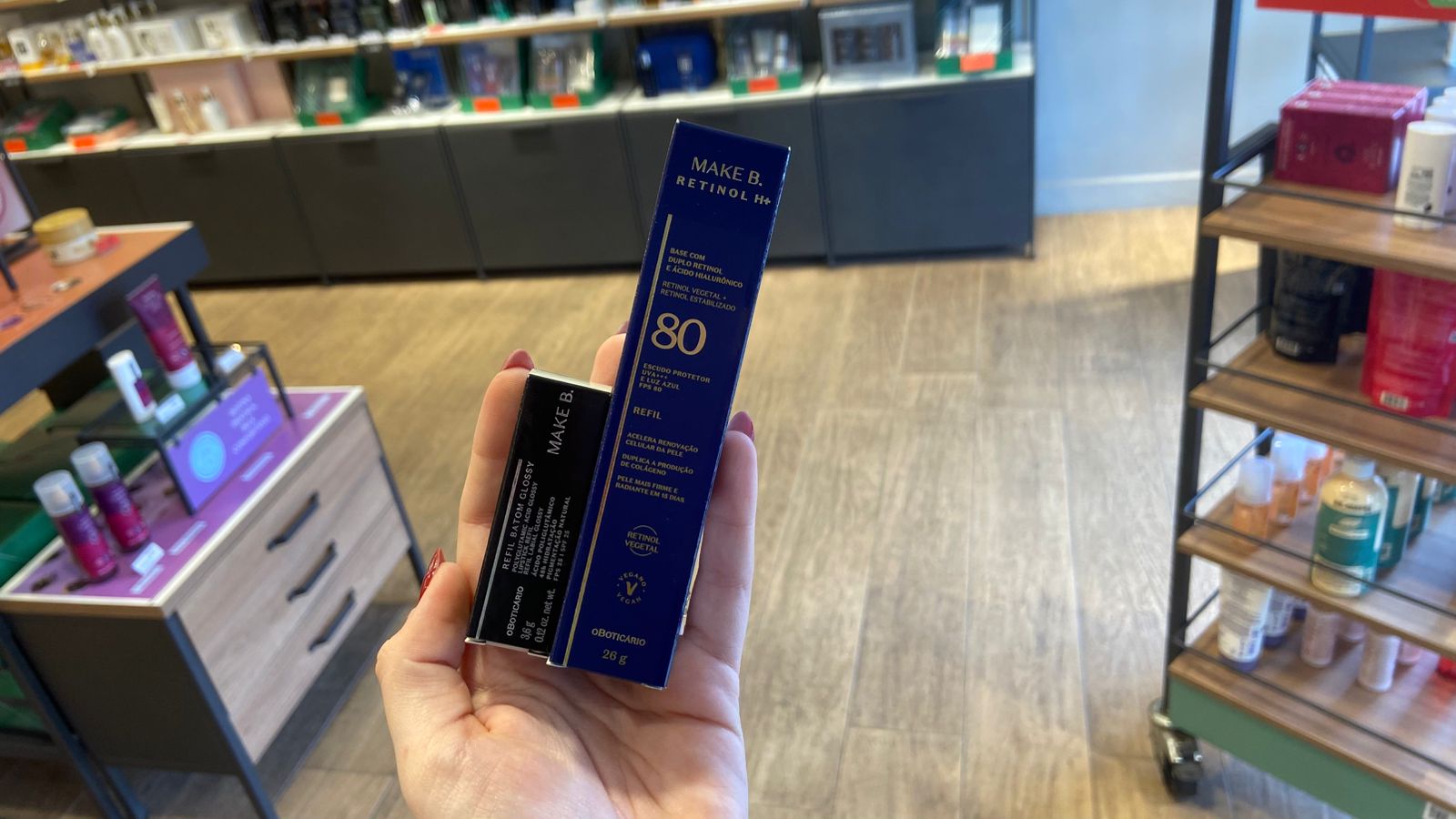 - Maquiagens como batons e bases da linha Make B;