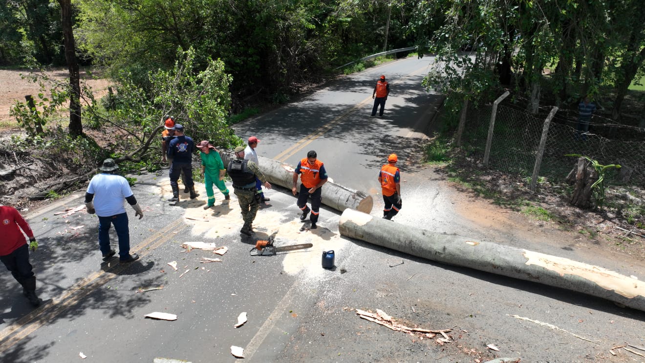 A ação mobilizou equipes especializadas para o corte controlado das árvores. Técnicos avaliaram previamente a área, isolaram o local e coordenaram o trabalho para minimizar riscos durante a remoção.