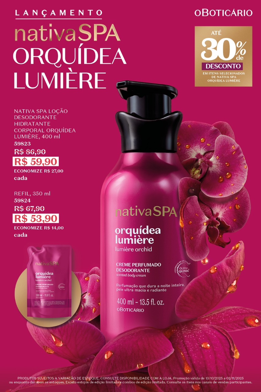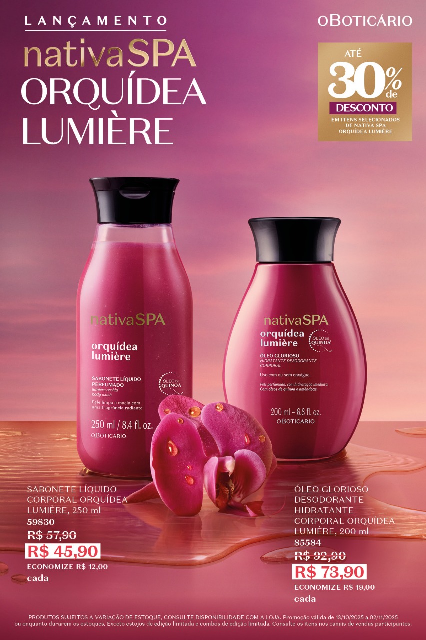 A linha Nativa SPA Orquídea Lumière traz uma perfumação sofisticada e duradoura, combinando o toque floral da orquídea com o brilho do Óleo de Quinoa, ingrediente reconhecido por seu alto poder nutritivo e hidratante. Composta por loção hidratante, óleo corporal, sabonete líquido, body splash e creme perfumado, a coleção oferece hidratação intensa e pele visivelmente mais macia, iluminada e radiante.