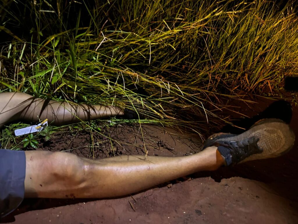 Pelo local o homem estava próximo a uma mata, perto dele havia somente um maço de cigarro aberto, um isqueiro enroscado no mato e seus calçados sujos de barro.