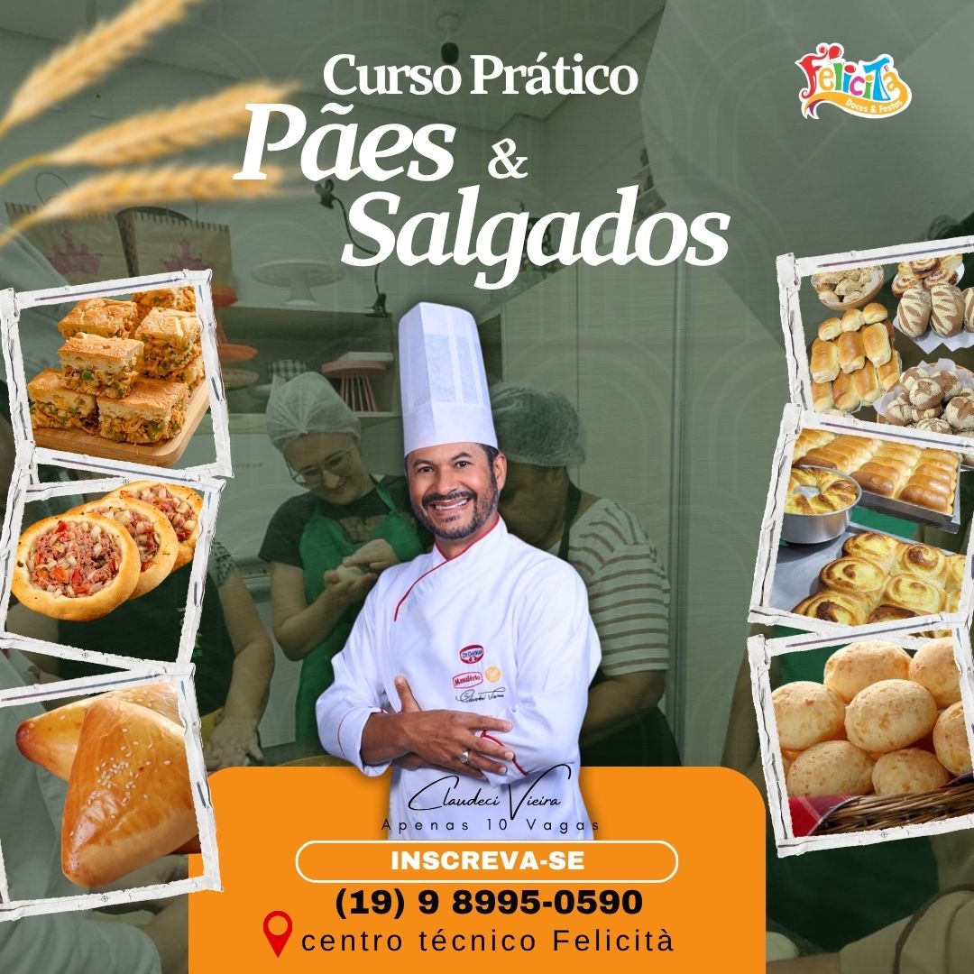 A Felicità Doces & Festas traz o “Super Curso de Panificação e Salgados”, uma experiência completa para quem quer produzir delícias irresistíveis e conquistar o paladar dos clientes com receitas que vendem e vendem muito!