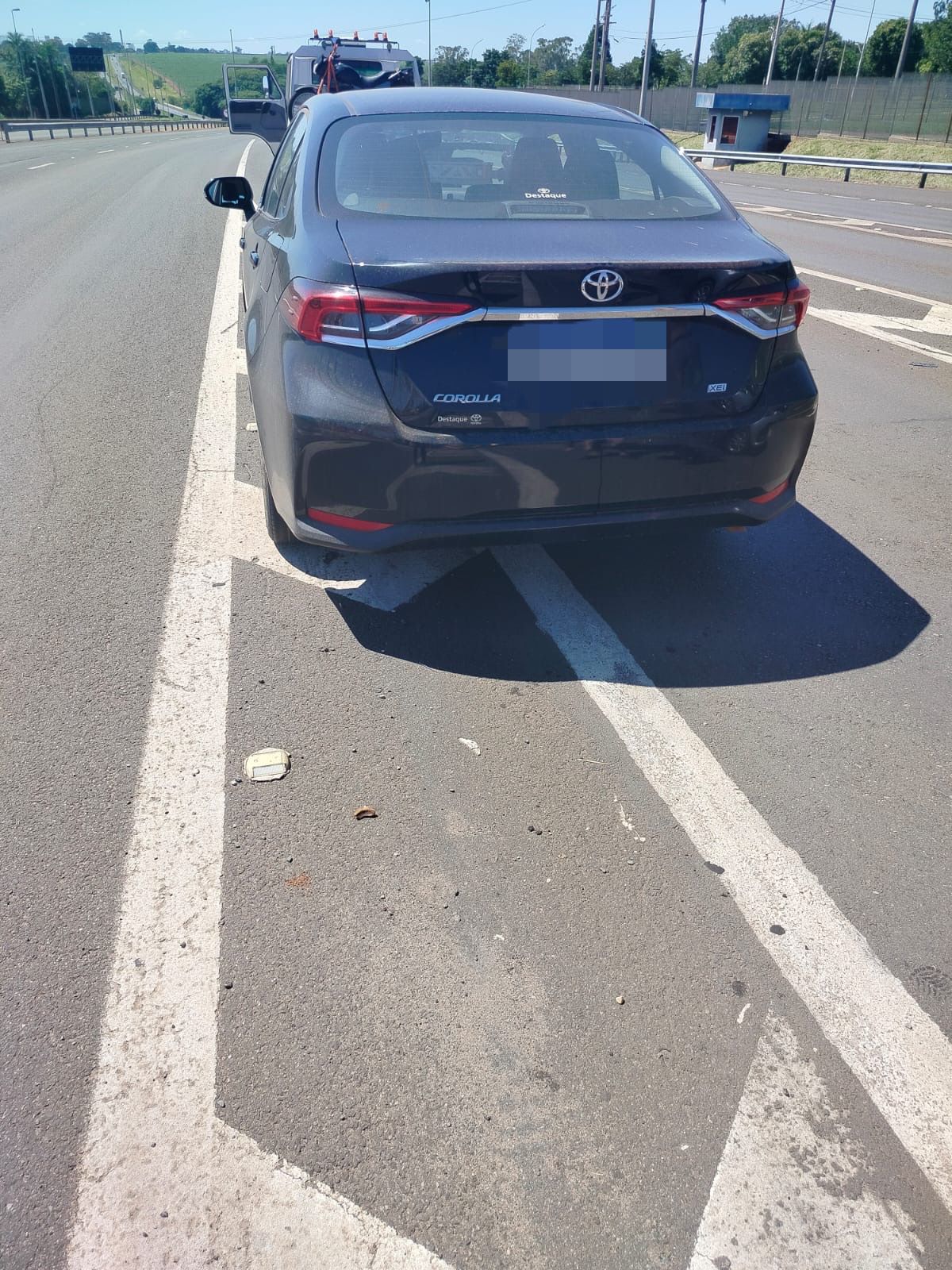 Os policiais realizavam a Operação Natal na praça de pedágio quando deram ordem de parada ao motorista de um Toyota Corolla. Após consulta à placa e aos dados do veículo, foi constatada a existência de uma ocorrência relacionada ao crime de estelionato.