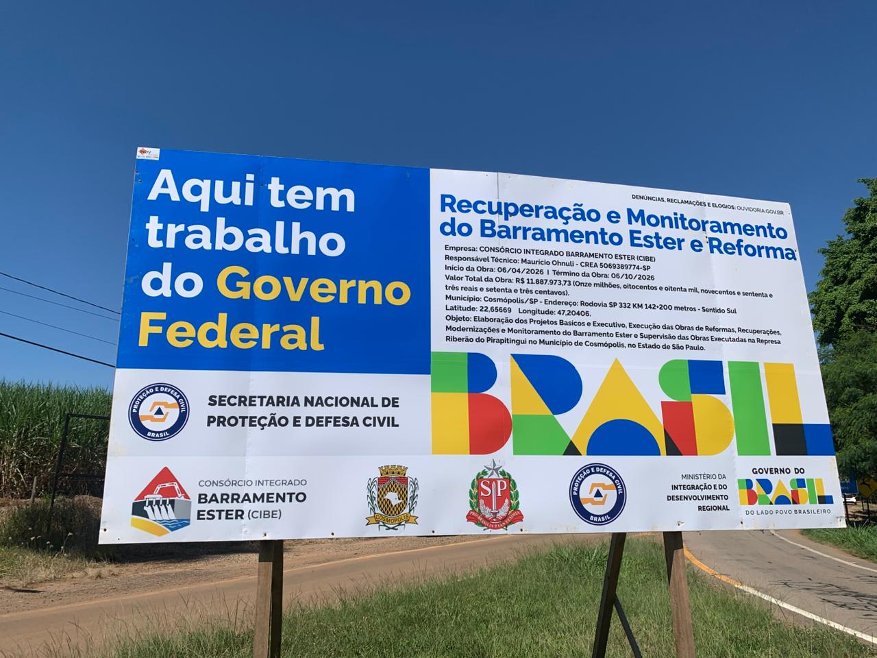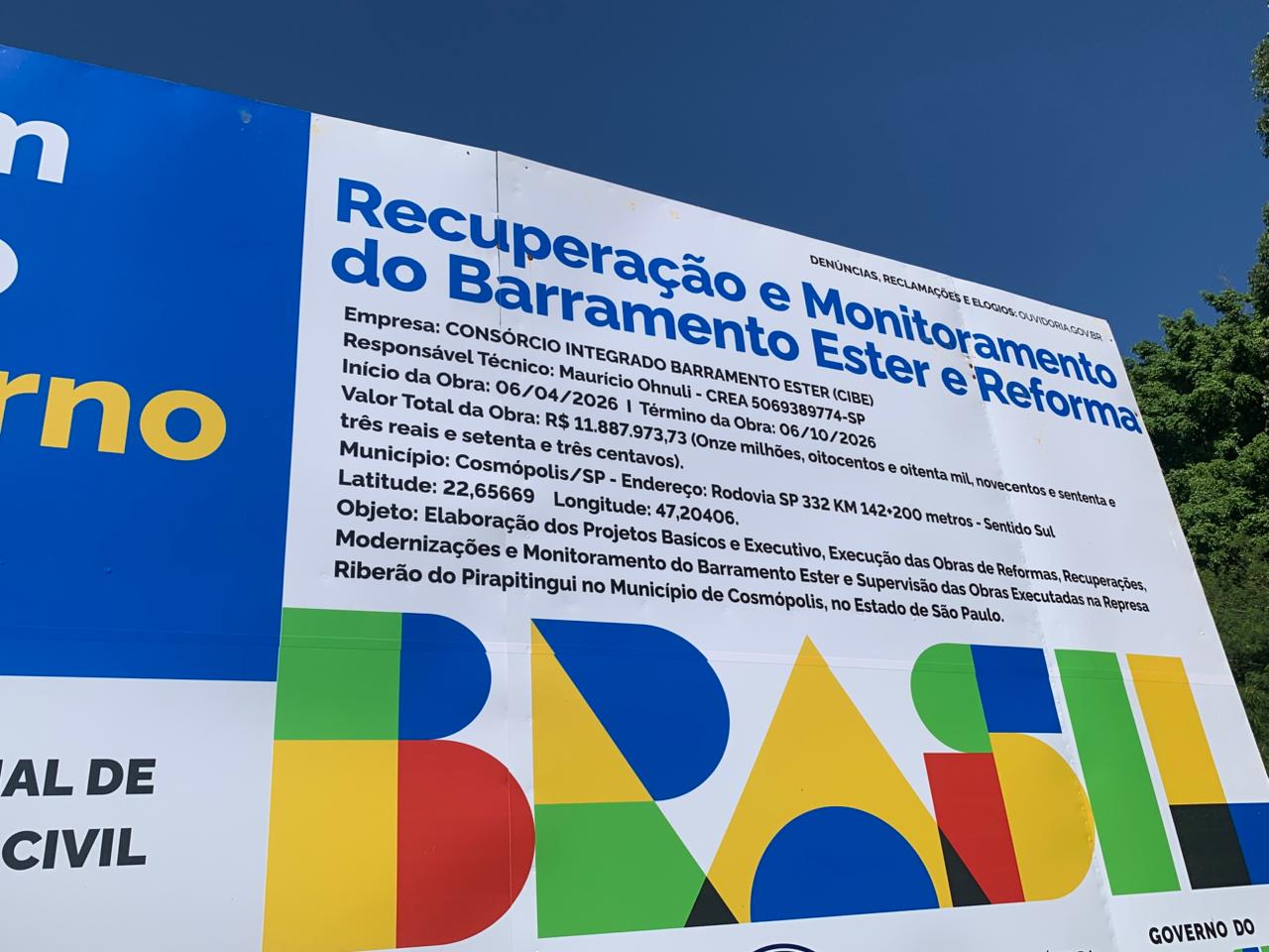 Embora placa instalada na entrada da Usina Ester indique entrega em seis meses, prefeitura já projeta para a mídia um ano para recuperação do barramento da represa em Cosmópolis