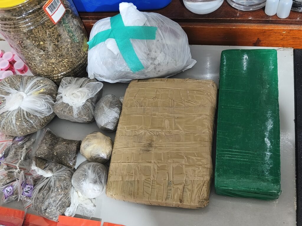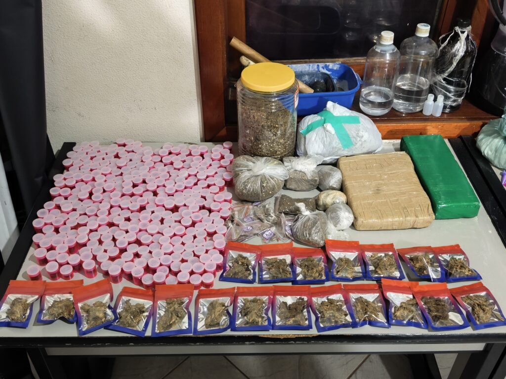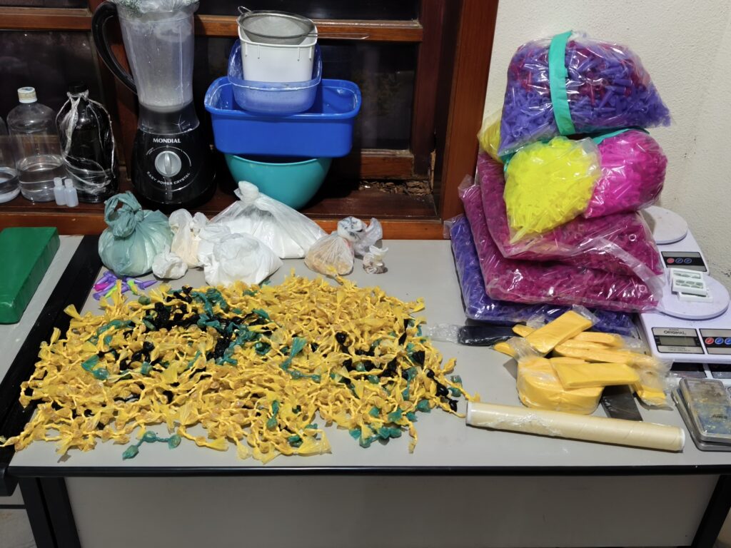Os agentes realizaram acompanhamento, mas o suspeito conseguiu escapar após pular telhados de imóveis vizinhos. Apesar da fuga, a equipe entrou no local denunciado e encontrou uma grande quantidade de substâncias análogas a entorpecentes, além de diversos materiais utilizados no preparo e embalagem das drogas.