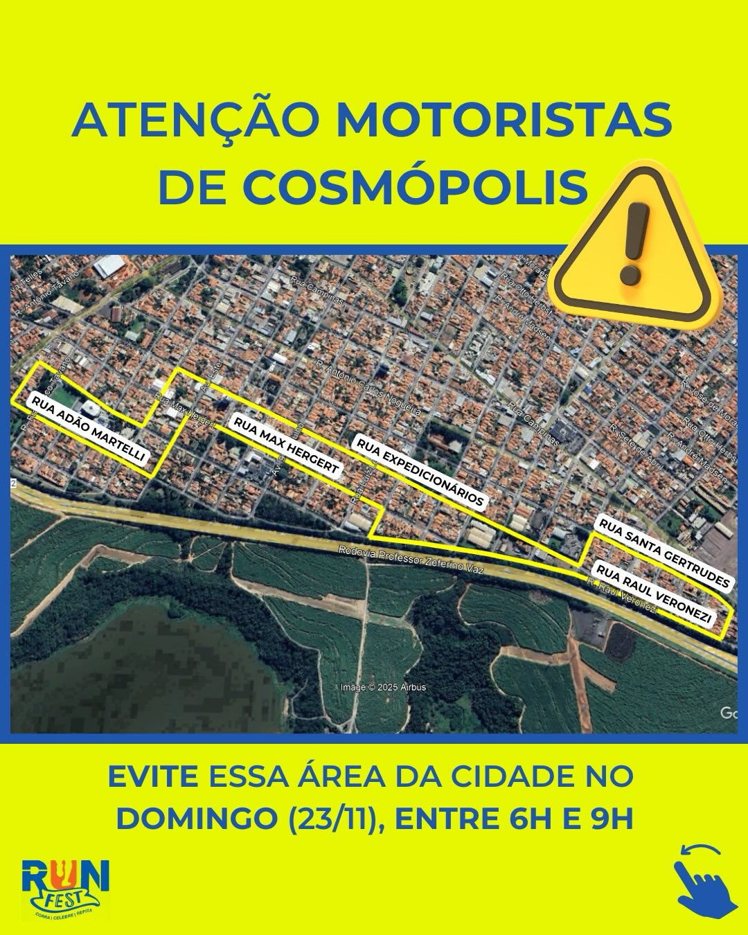 A Corrida Run Fest – Niver City vai provocar interdições temporárias no trânsito de Cosmópolis na manhã deste domingo (23), entre 6h e 9h, conforme divulgado pela Prefeitura Municipal. O evento, que integra o calendário oficial de comemorações pelos 81 anos do município, percorre diversas vias da região central e bairros próximos, exigindo alterações no fluxo de veículos.