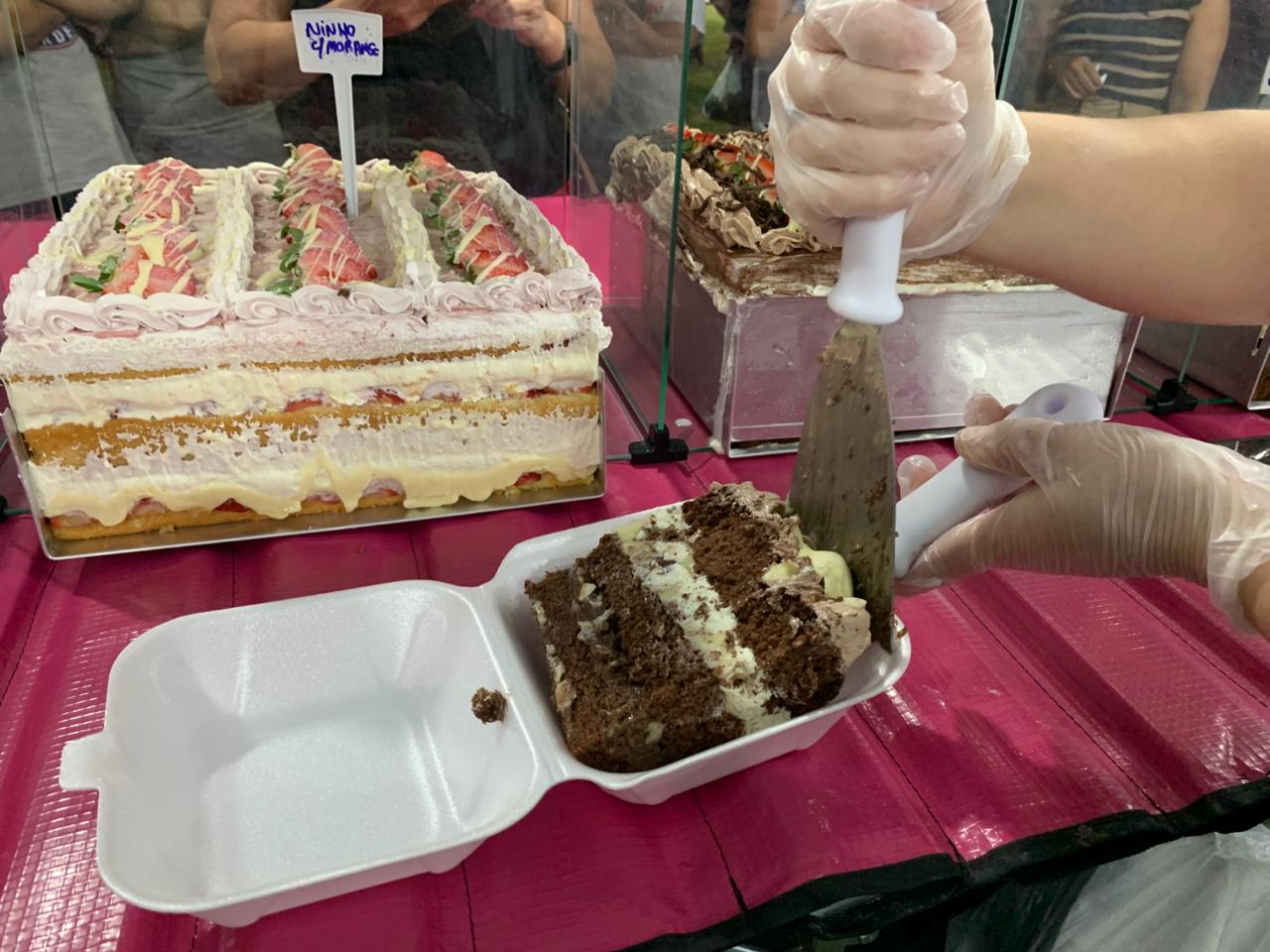 “Hoje, produzimos cerca de 9 bolos, que somam pouco mais de 100 kg. Vendemos, em média, 190 fatias por feira, e elas se esgotam em cerca de 1h30. Temos sabores queridinhos, como Kinder Bueno e bombom de morango, e não podemos esquecer do bolo pudim. Também temos um sabor exclusivo de Stikadinho com chocolate, uma releitura de uma receita de família: cocada de abacaxi” – Joyce