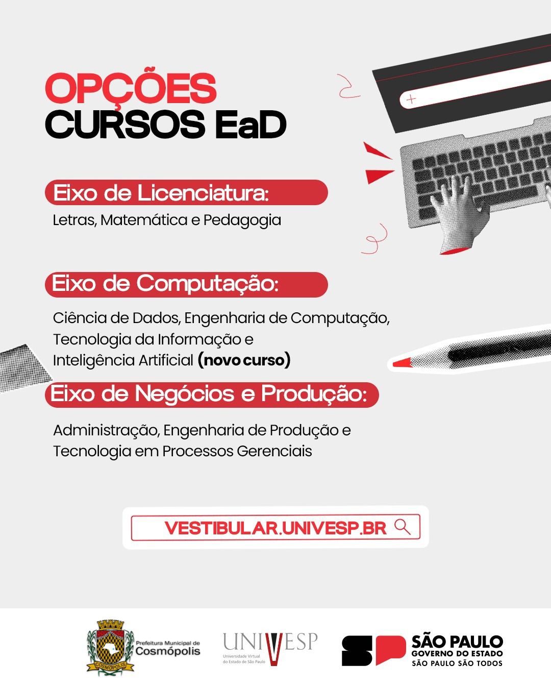 A Universidade Virtual do Estado de São Paulo (Univesp) abriu as inscrições para o Vestibular 2026. Os interessados podem se inscrever até o dia 13 de março, às 23h59, exclusivamente pelo site: vestibular.univesp.br. No total, serão ofertadas 24.029 vagas em 10 cursos, destinadas a 456 polos, de 386 municípios.
