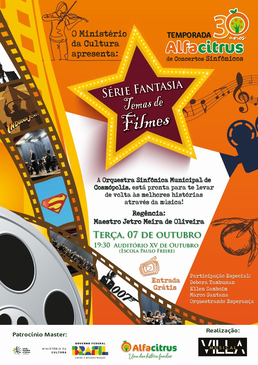 No dia 07 de outubro, às 19h30, o Auditório XV de Outubro (Escola Paulo Freire) será palco do concerto “Série Fantasia”, apresentado pela Orquestra Sinfônica Municipal de Cosmópolis, sob a regência do Maestro Jetro Meira de Oliveira.