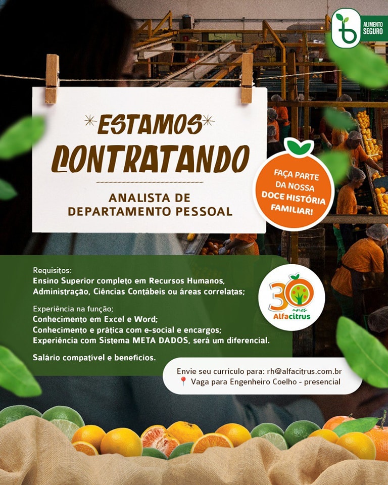 Alfacitrus abre vaga para Analista de Departamento Pessoal em Engenheiro Coelho