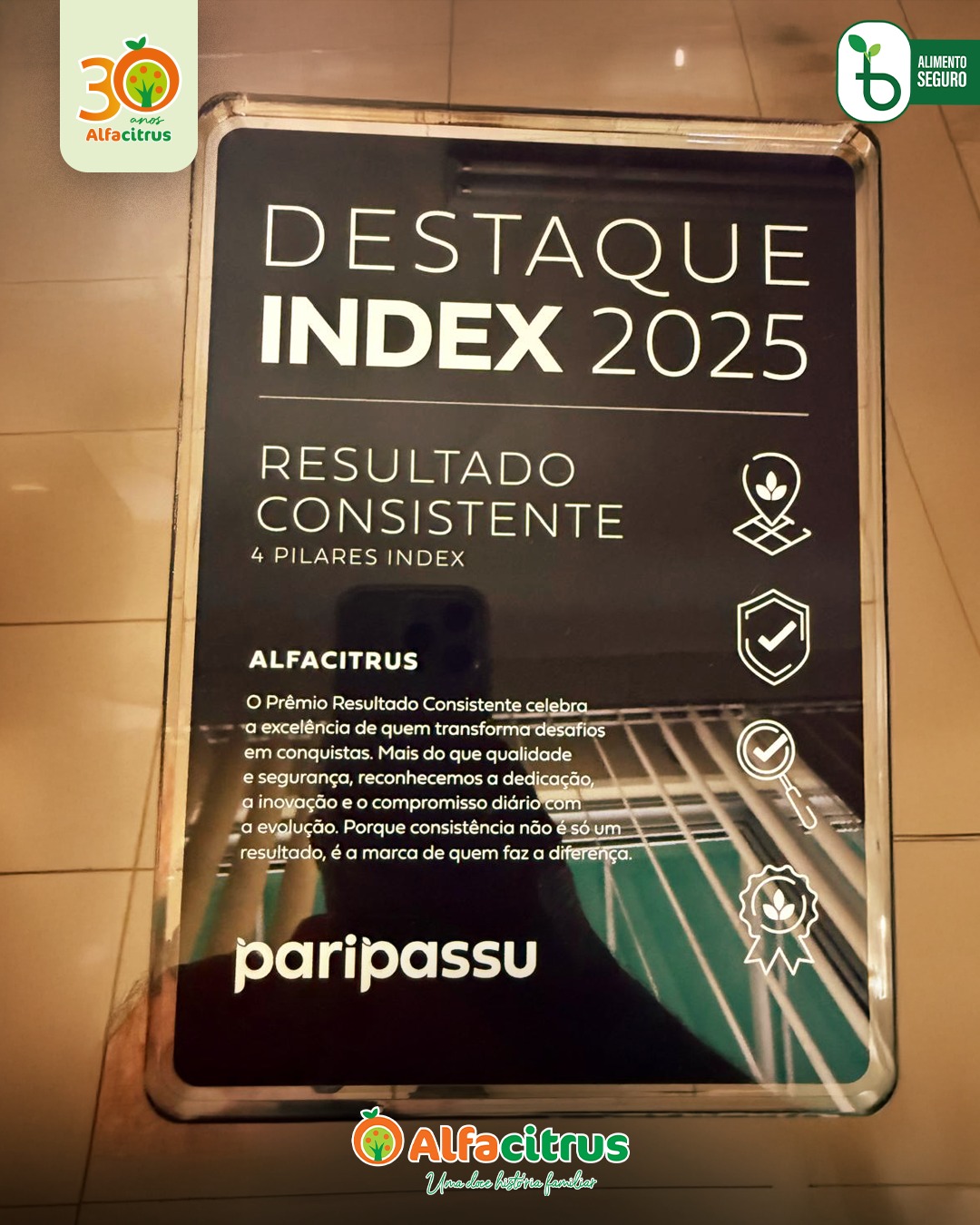 A trajetória da Alfacitrus acaba de ganhar mais um capítulo marcante. No dia 23 de abril de 2025, a empresa foi reconhecida, mais uma vez, pelo INDEX Paripassu, o mais importante indicador de qualidade e segurança dos alimentos para o setor de Frutas, Folhosas, Legumes e Verduras (FFLVO). O prêmio celebra o desempenho consistente da Alfacitrus em sua atuação junto à cadeia produtiva de alimentos.