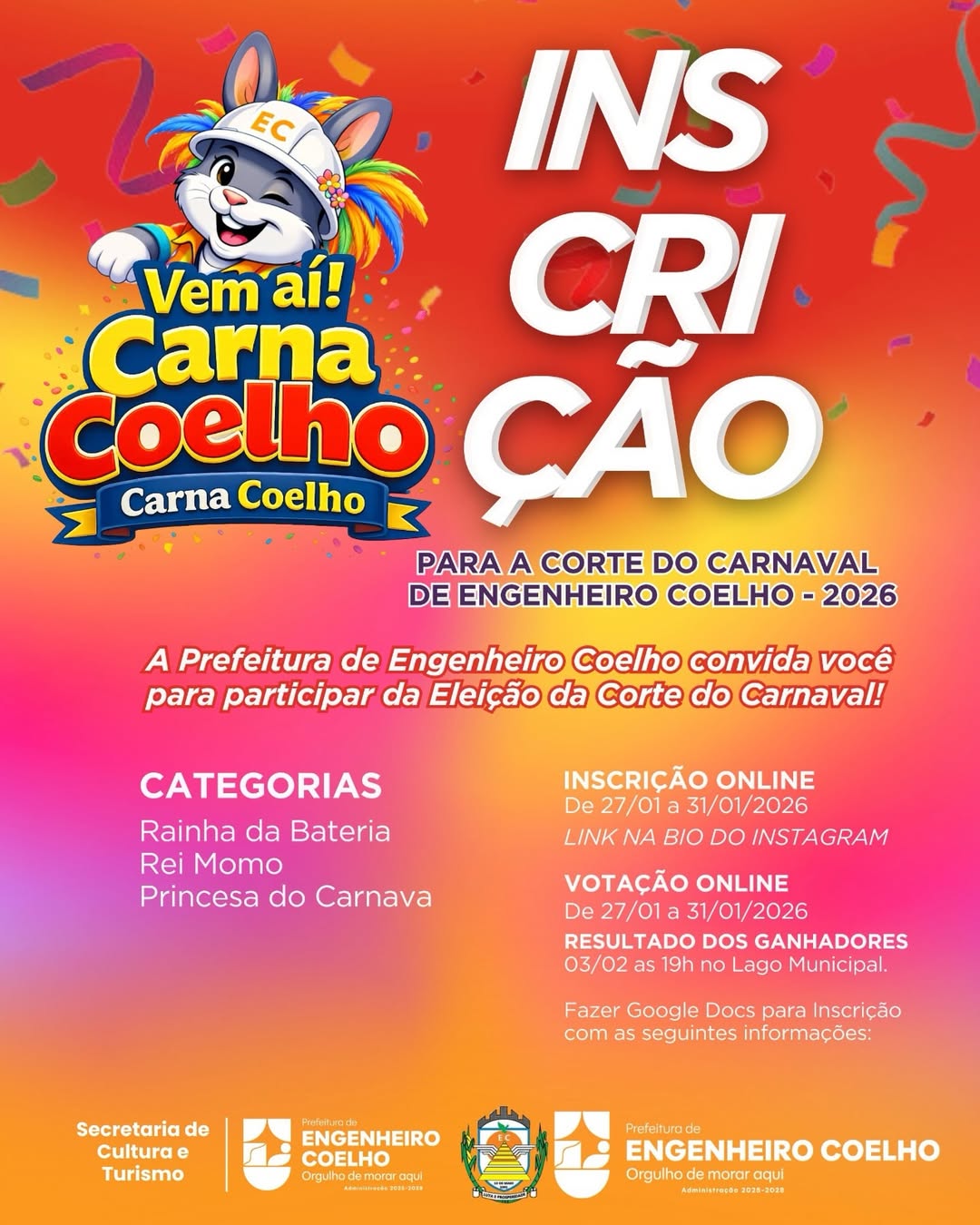 A Prefeitura de Engenheiro Coelho anunciou a abertura das inscrições para a Eleição da Corte do Carnaval 2026, que marcará oficialmente a chegada do Carna Coelho no município. A iniciativa busca valorizar a cultura popular e incentivar a participação da comunidade nas festividades carnavalescas.