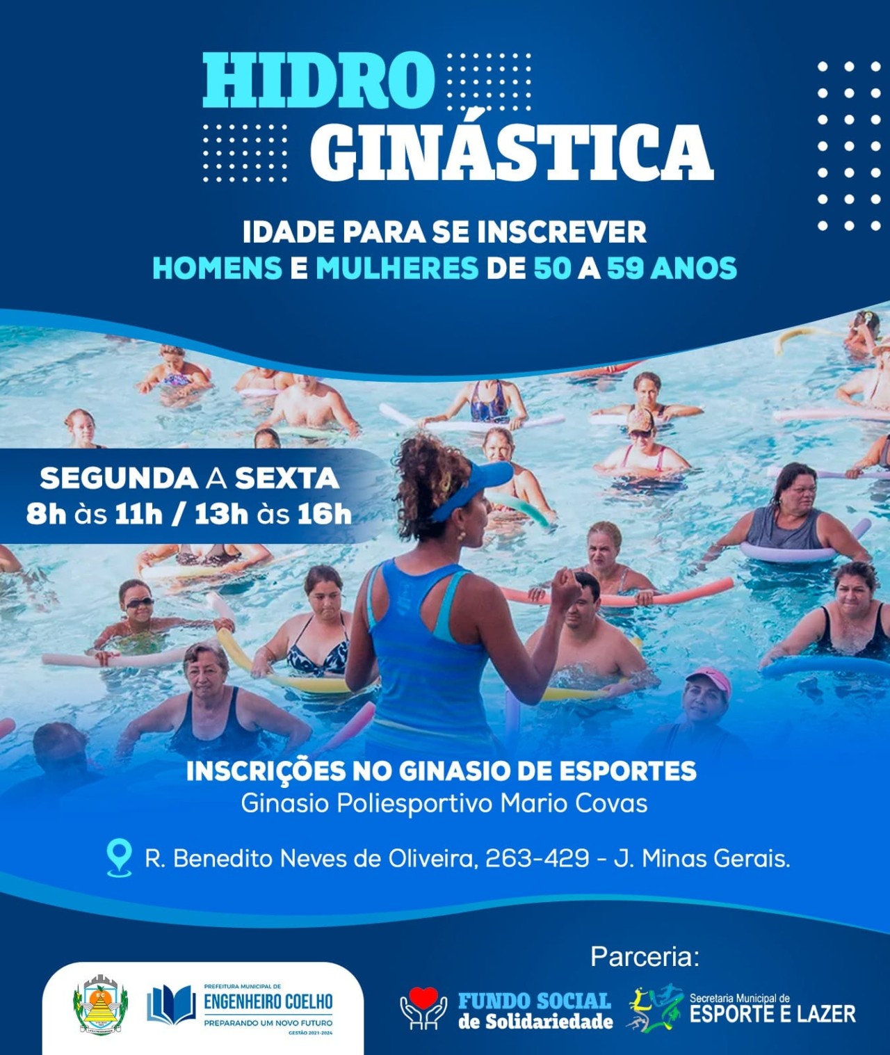 A Prefeitura de Engenheiro Coelho em parceira com as Secretarias de Esporte e Lazer e Fundo Social de Solidariedade abrem inscrições para Aulas de Hidroginástica, para homes e mulheres com idade de 50 à 59 anos, a partir de segunda feira (13).
