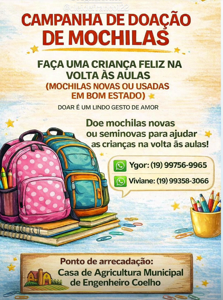 A Prefeitura de Engenheiro Coelho está promovendo uma Campanha de Doação de Mochilas com o objetivo de ajudar crianças do município no período de volta às aulas. A iniciativa busca arrecadar mochilas novas ou usadas em bom estado, reforçando a importância da solidariedade e do apoio à educação.