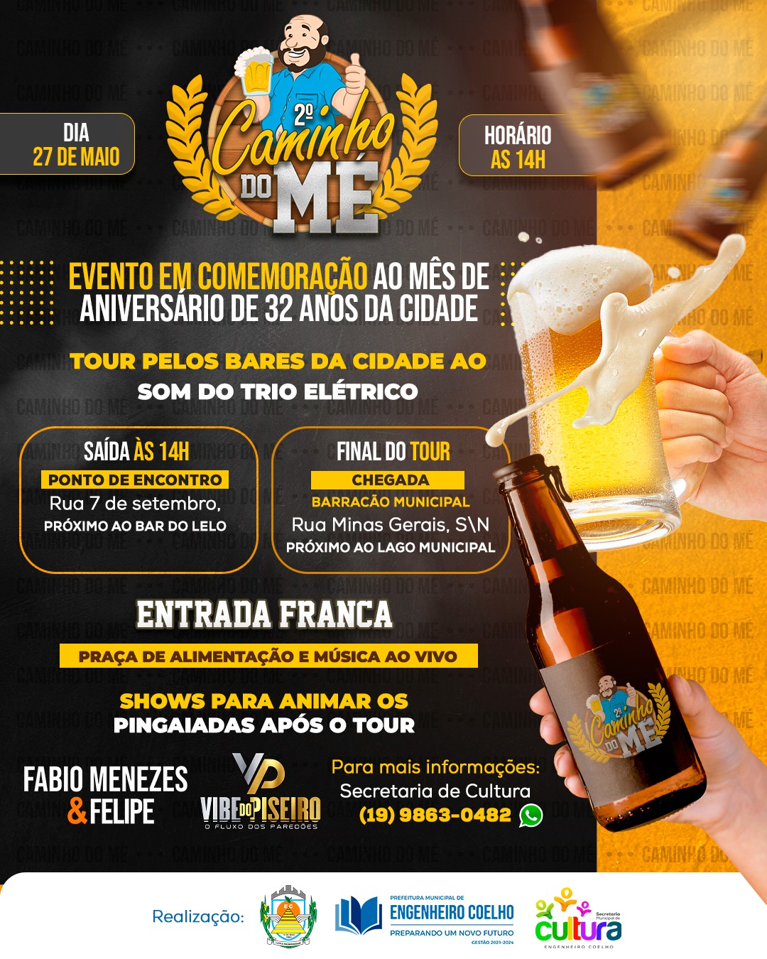 Ainda celebrando os 32 anos do município coelhense, no dia 27 de maio, a Prefeitura realizará o evento “2° Caminho do Mé Engenheiro Coelho”. O evento será realizado pelo segundo ano no município e é aberto à comunidade. Os interessados em participar e adquirir um “ABADÁ” da festa devem se inscrever em um dos grupos já existentes ou formar seu próprio grupo até o dia 7 de maio.