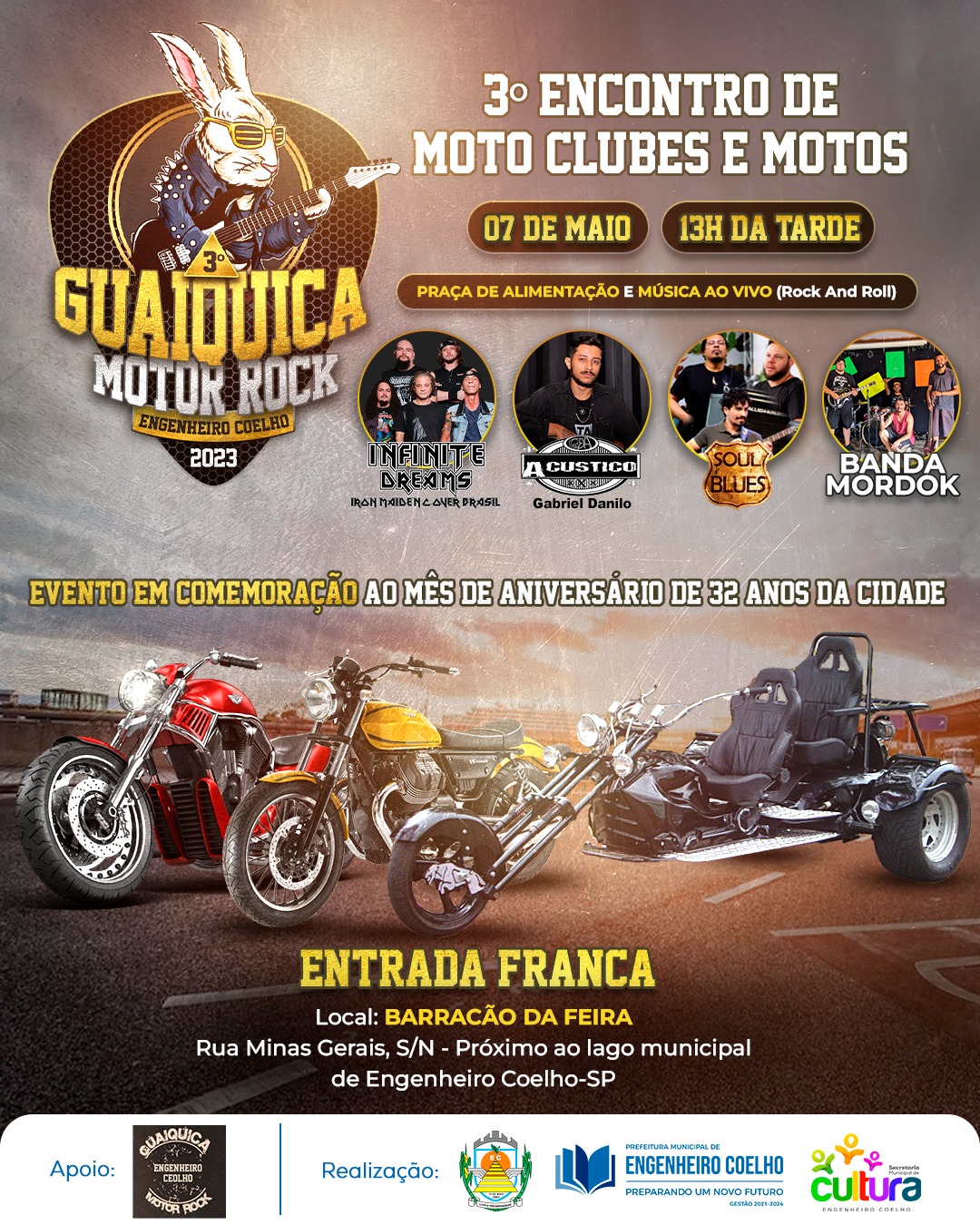 A partir das 13h, o Barracão da Feira receberá as atrações musicais do 3° Guaiquica Motor Rock 2023, que incluem a Banda Infinite Dreams – Iron Maiden Cover Brasil, Gabriel Danilo Acústico, Soul Blues e Banda Mordock. O “Encontro de Carros Antigos” deste ano tem o apoio do Clube dos Carros Antigos de Limeira e o 3° Guaiquica Motor Rock tem o apoio da Guaiquica Motor Rock – Engenheiro Coelho.