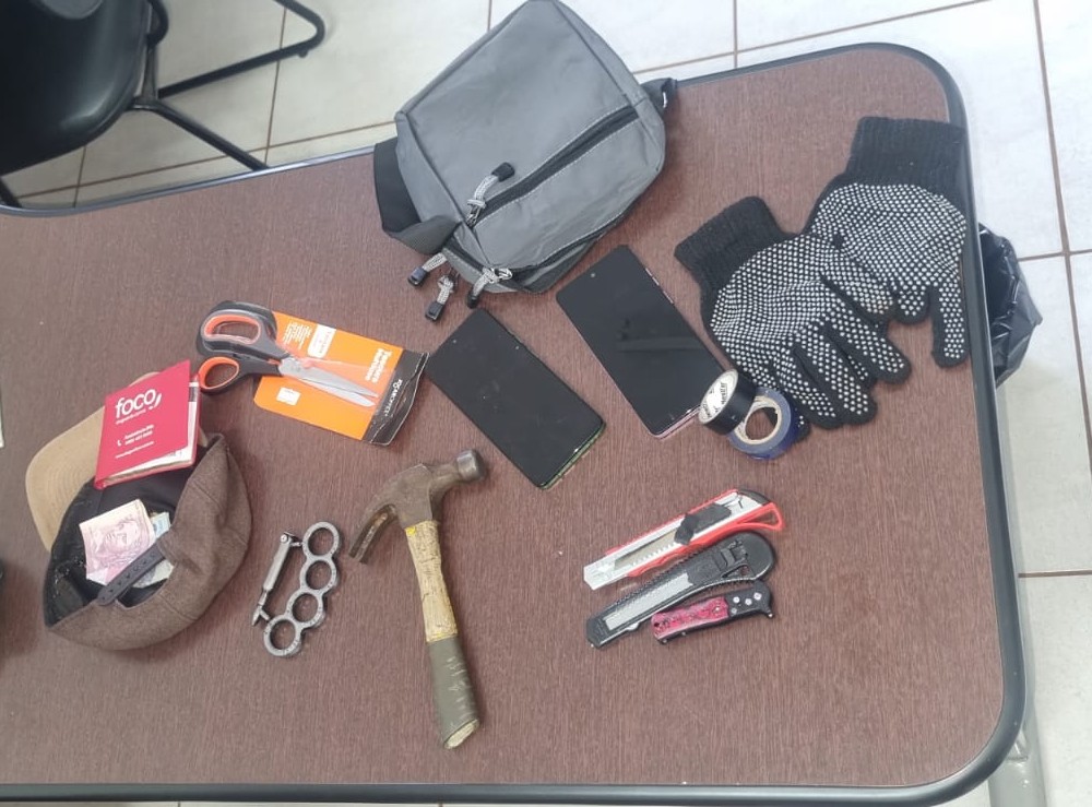 Em revista pessoal, nada de ilícito foi encontrado com os dois naquele momento. O condutor chamou a atenção por estar com o rosto coberto por uma substância que alterava a tonalidade da pele. Questionado, ele afirmou que participava de eventos em bares da região. Já na busca em uma pochete que ele carregava, os policiais encontraram rolos de fita isolante — compatíveis com o material usado na adulteração da placa — além de estiletes.