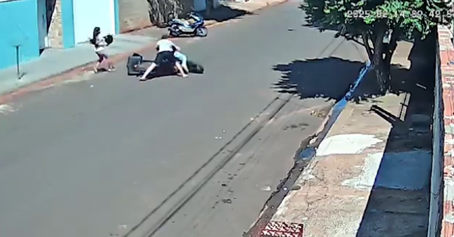 Nesse momento, as vítimas saem de um comércio e veem o crime. Sem pensar duas vezes, o jovem e a moça avançam contra o ladrão, que cai da moto. Ele continua levando chutes até que consegue se levantar e fugir. Ele ainda não foi localizado.