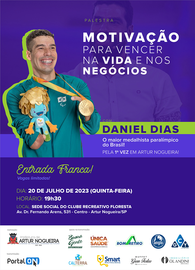O maior medalhista paralímpico do Brasil, Daniel Dias, fará uma palestra inédita em Artur Nogueira na quinta-feira, dia 20 de julho. O evento motivacional é voltado para empresários, comerciantes e funcionários que buscam motivação na vida profissional e pessoal. A palestra será presencial na sede do Clube Recreativo Floresta, no centro, e possui vagas limitadas.