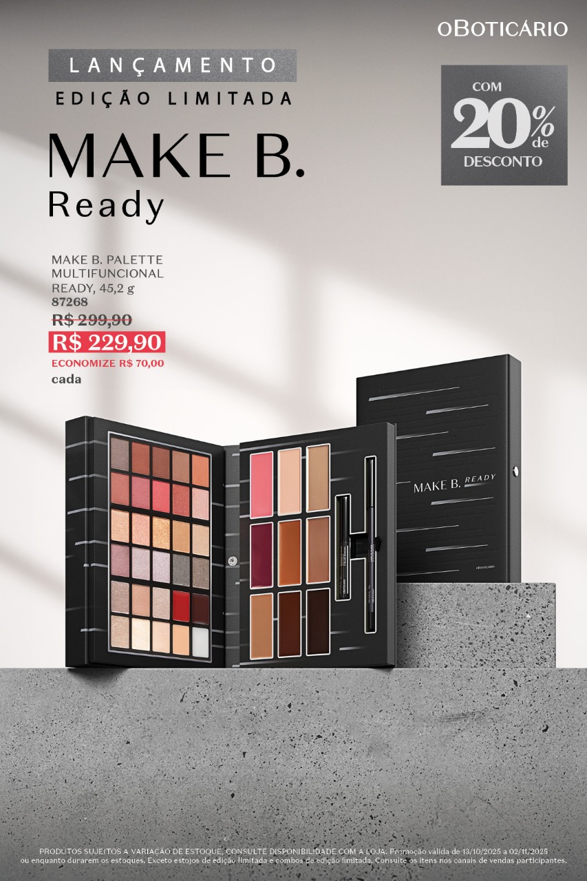 A nova Make B. Ready já está disponível nas lojas físicas e no site oficial do Boticário. Aproveite a promoção por tempo limitado e descubra o poder de uma make completa, prática e sofisticada. Estar pronta nunca foi tão fácil e tão bonito.