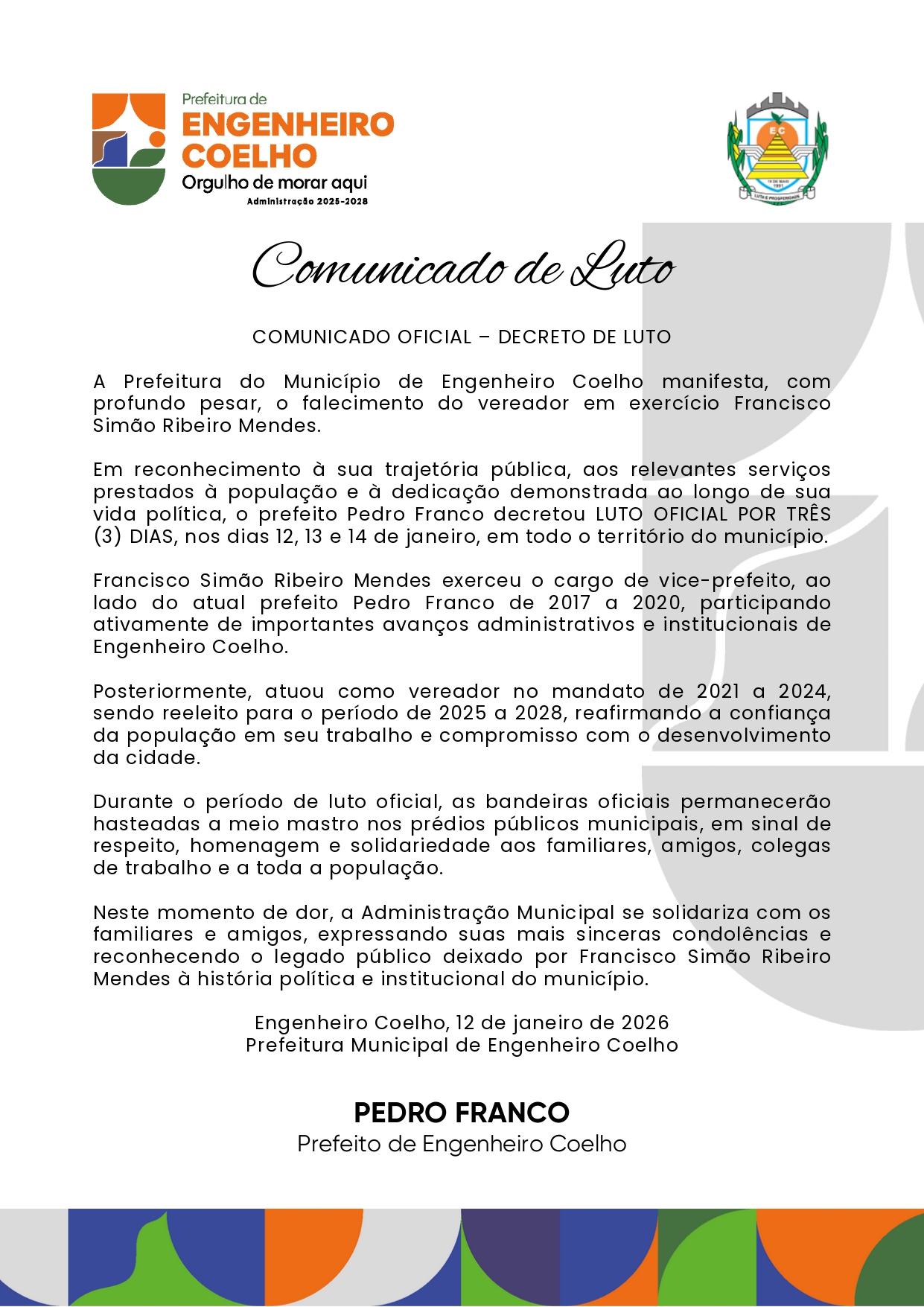 A Prefeitura de Engenheiro Coelho decretou luto oficial por três dias em razão do falecimento do vereador em exercício Francisco Simão Ribeiro Mendes. A medida foi oficializada por meio de decreto assinado pelo prefeito Pedro Franco, como forma de reconhecimento à trajetória pública.