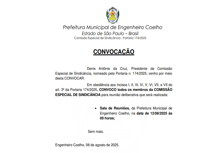 Uma nova reunião da comissão especial de sindicância aberta no início de julho pela Prefeitura para apurar irregularidades em obras realizadas no Parque de Exposição, em Engenheiro Coelho (SP), acontece às 9h desta terça-feira (12), na Sala de Reuniões da Prefeitura. A convocação de todos os membros da comissão foi publicada no Diário Oficial da cidade pelo presidente Dênis da Cruz.