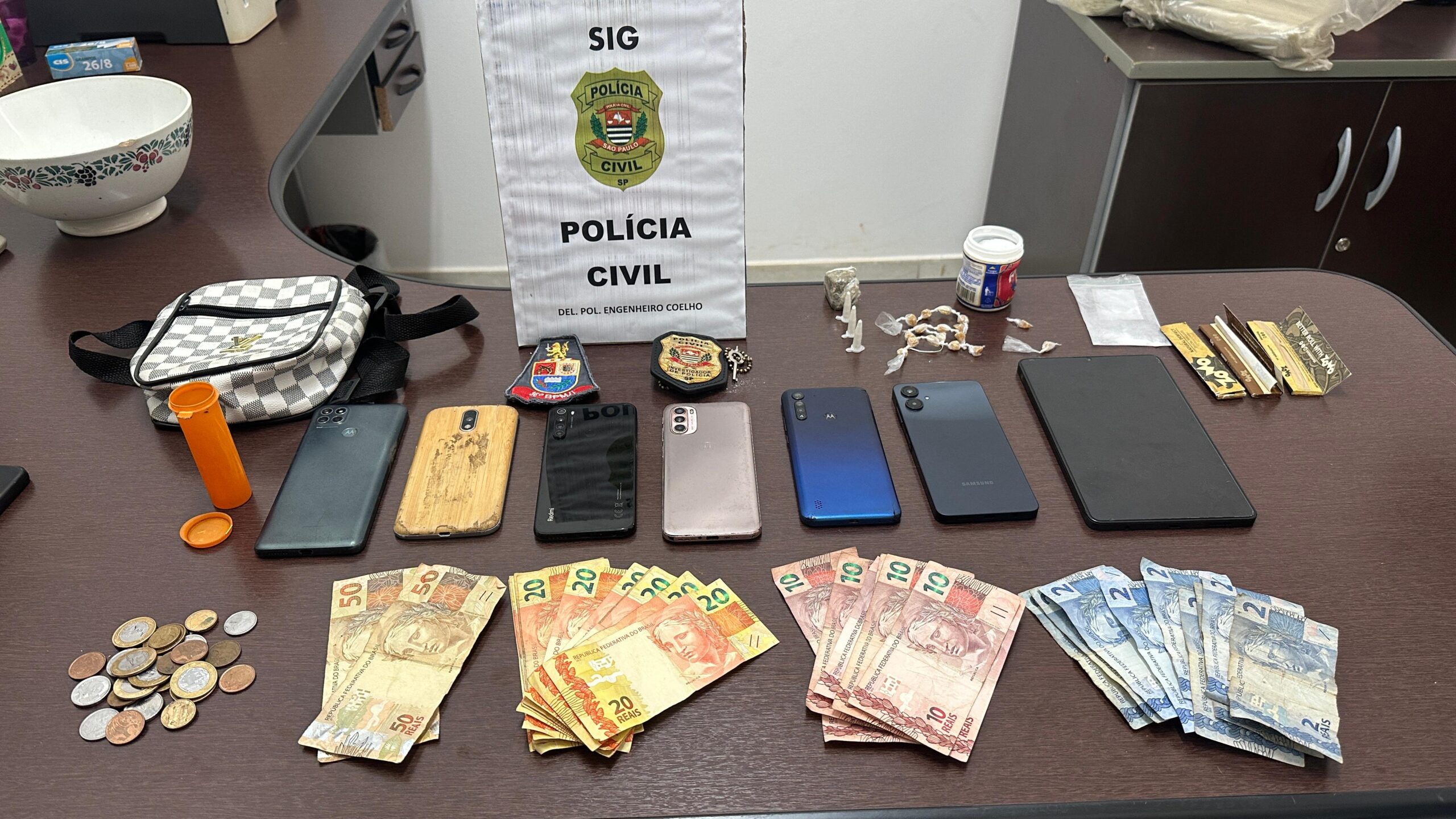 Uma ação conjunta da Polícia Civil e da Polícia Militar, realizada na tarde desta quarta-feira (8), resultou na prisão de um homem por tráfico de drogas em Engenheiro Coelho, além da apreensão de uma grande quantidade de entorpecentes, dinheiro e uma motocicleta com irregularidades. A operação ocorreu em uma residência no Jardim São Paulo, já conhecida pelas autoridades por suspeita de ser ponto de tráfico.