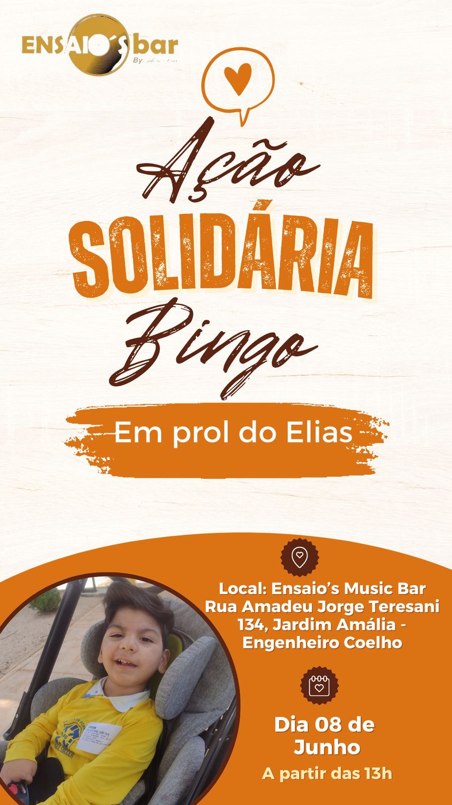 A cidade de Engenheiro Coelho tem se unido em uma campanha solidária para ajudar o pequeno Elias Rangel Lázaro Filho de apenas quatro anos, que sofre de paralisia cerebral, a realizar uma cirurgia que pode melhorar significativamente sua qualidade de vida. Além de uma vaquinha online, amigos e familiares têm promovido diversas ações com o objetivo de arrecadar o valor necessário para o procedimento cirúrgico.