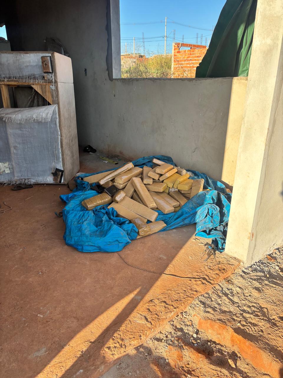 Vazia e sem acabamento, a construção servia de esconderijo para ao menos trinta e sete tijolos de entorpecentes embalados em uma lona plástica, geralmente utilizada em construção civil.