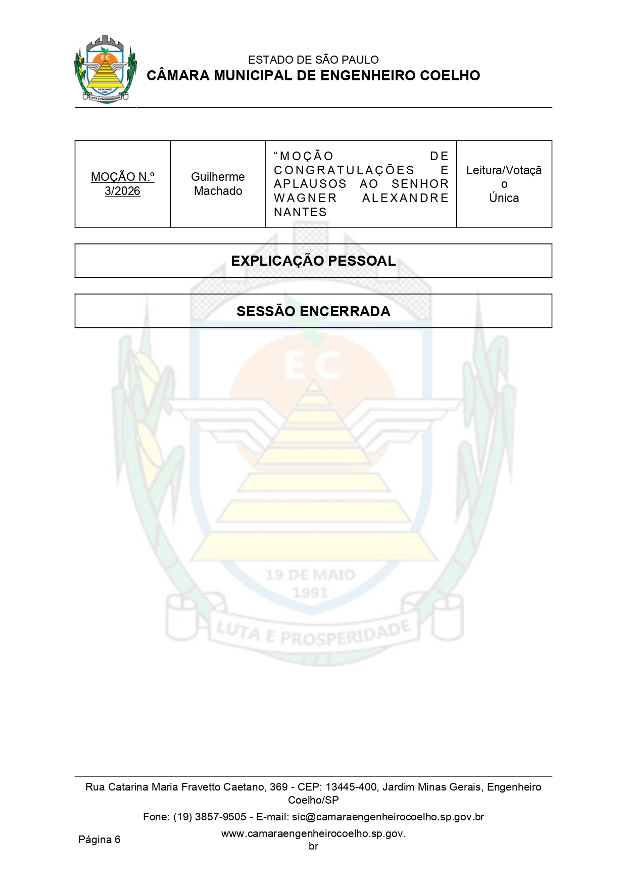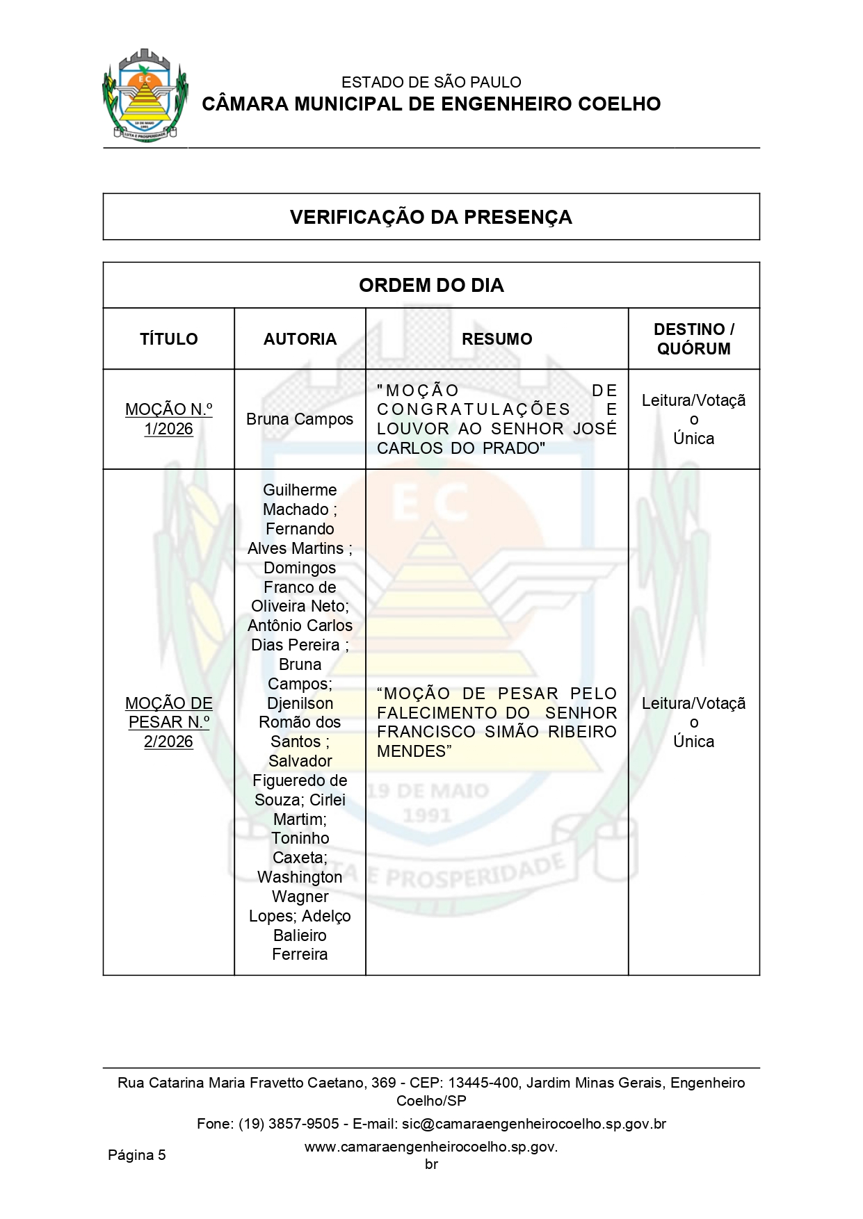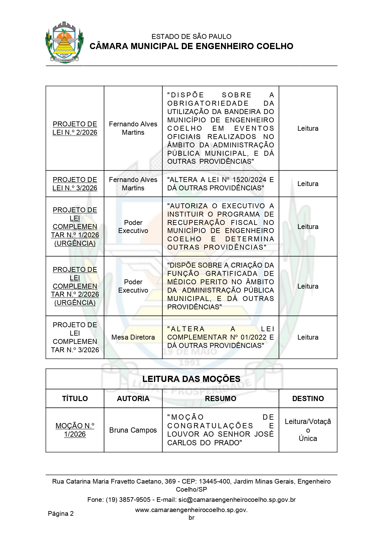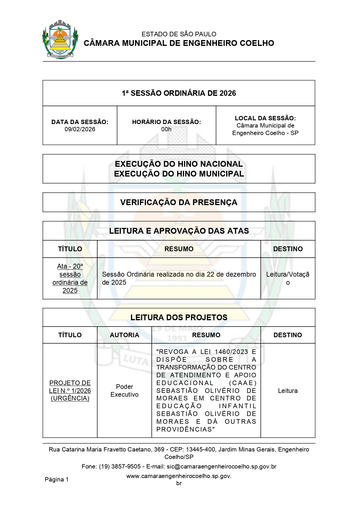 A Câmara Municipal de Engenheiro Coelho realiza nesta segunda-feira (09), às 19h15, a 1ª Sessão Ordinária de 2026, marcando oficialmente o início dos trabalhos legislativos do ano. A sessão acontece na sede do Legislativo e contará com uma pauta extensa, incluindo projetos de lei, projetos complementares em regime de urgência, moções e indicações dos vereadores.