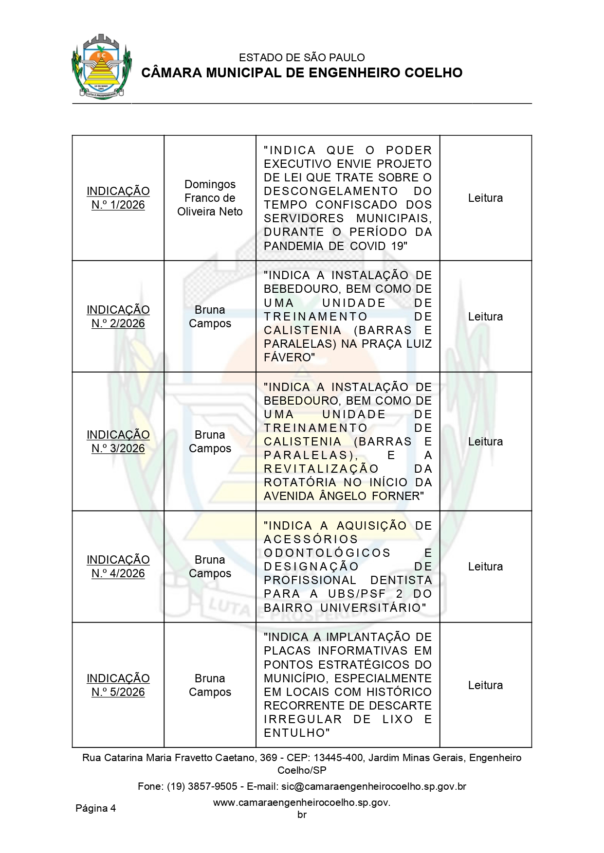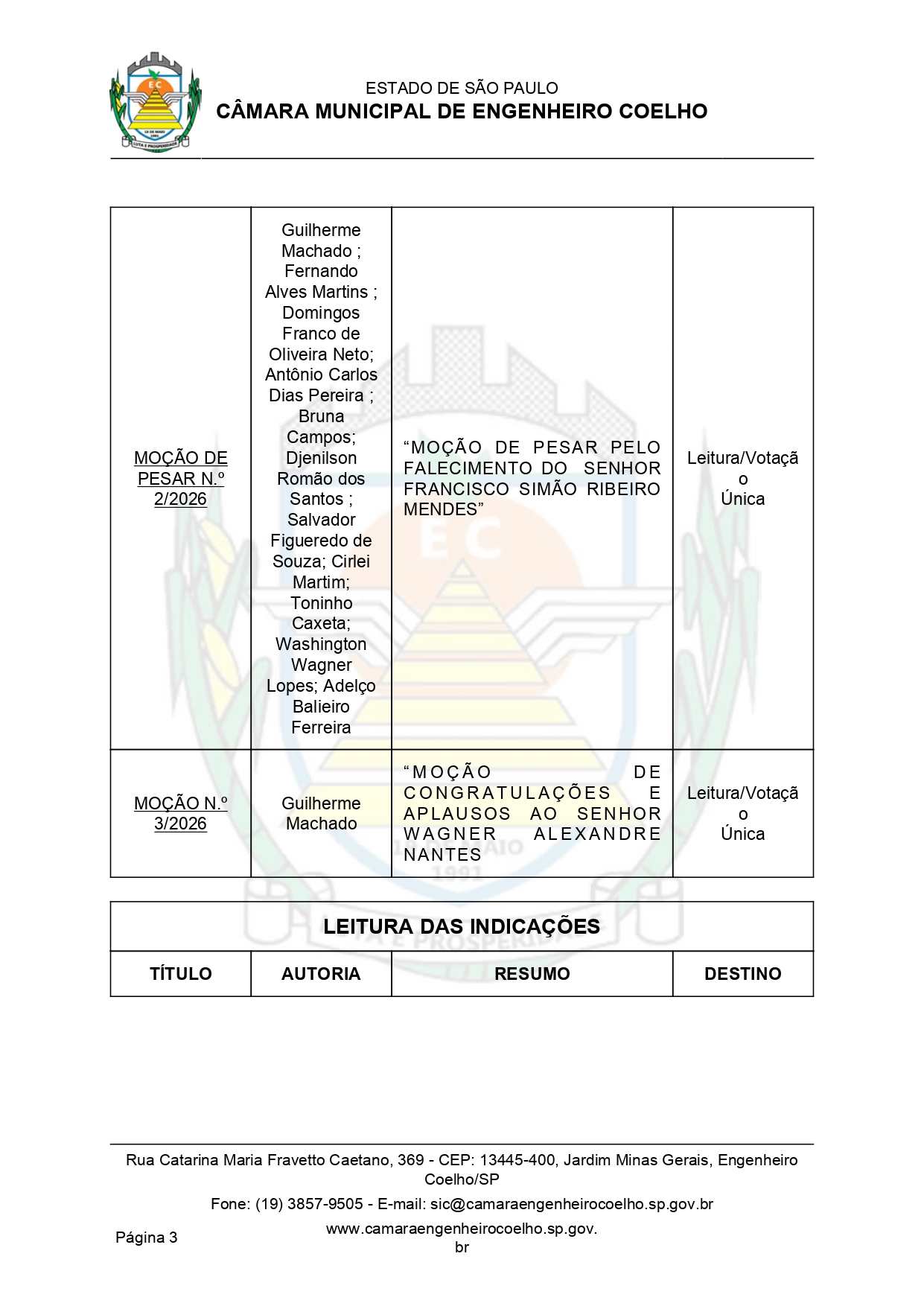 A pauta ainda inclui moções de congratulações, aplausos e pesar, além de diversas indicações, como pedidos para instalação de bebedouros, equipamentos de calistenia, melhorias urbanas e medidas voltadas aos servidores públicos.