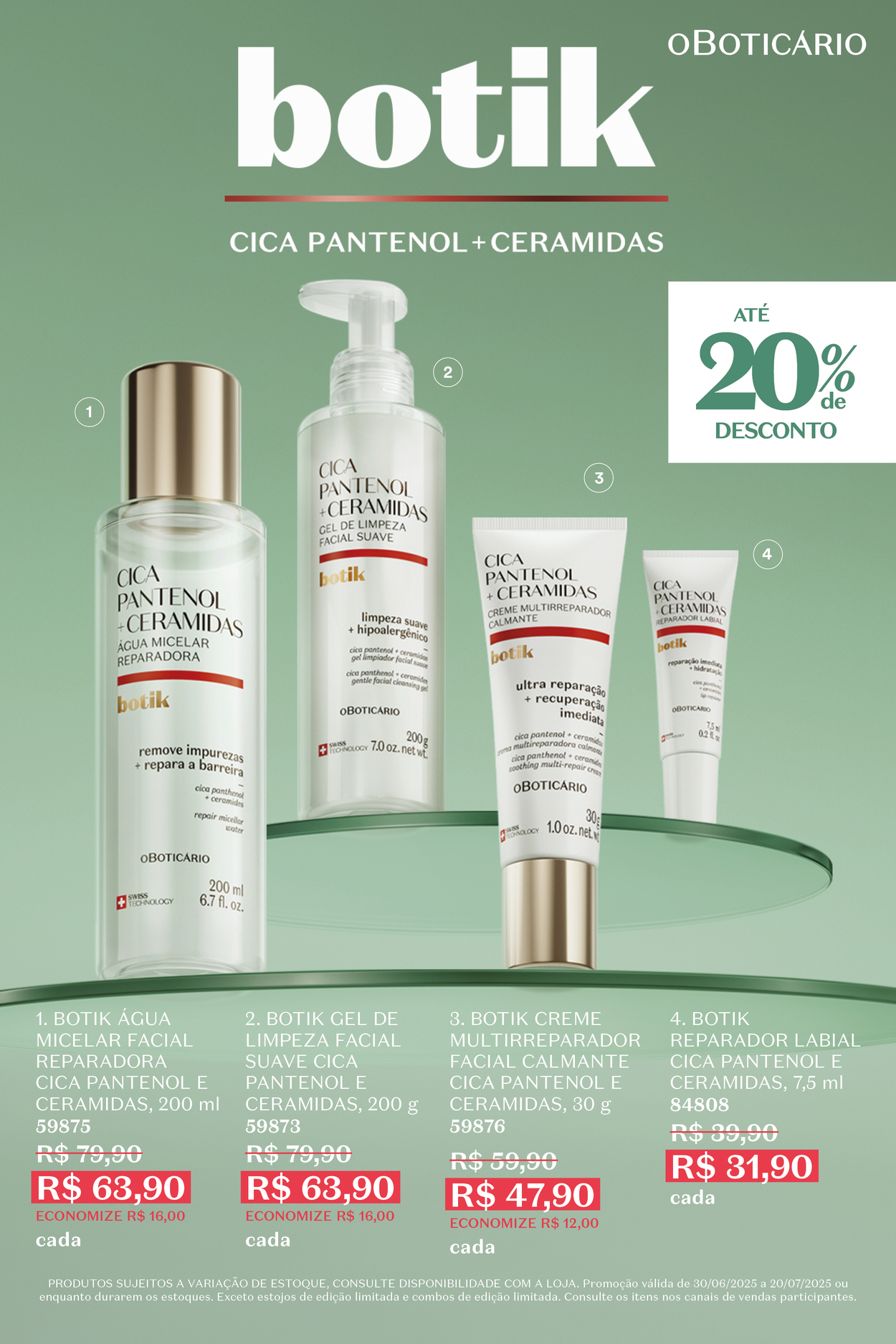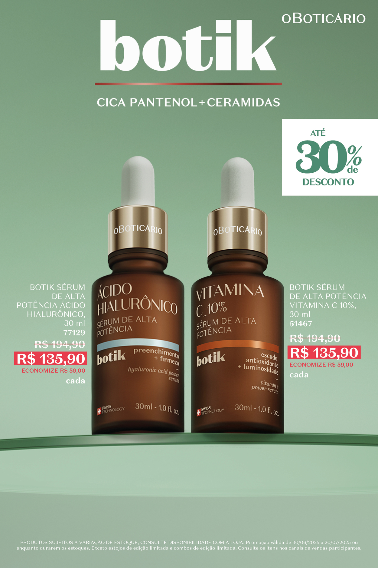 Cuidar da pele é mais do que uma questão de estética: é um gesto de saúde, bem-estar e autoestima. E para isso, O Boticário aposta em inovação, ciência e sofisticação com a linha Botik, desenvolvida com tecnologia suíça e ativos de alta performance, pensados especialmente para a pele brasileira. As linhas Cica Pantenol + Ceramidas e os Séruns de Alta Potência são alguns dos destaques e estão com até 30% de desconto por tempo limitado.