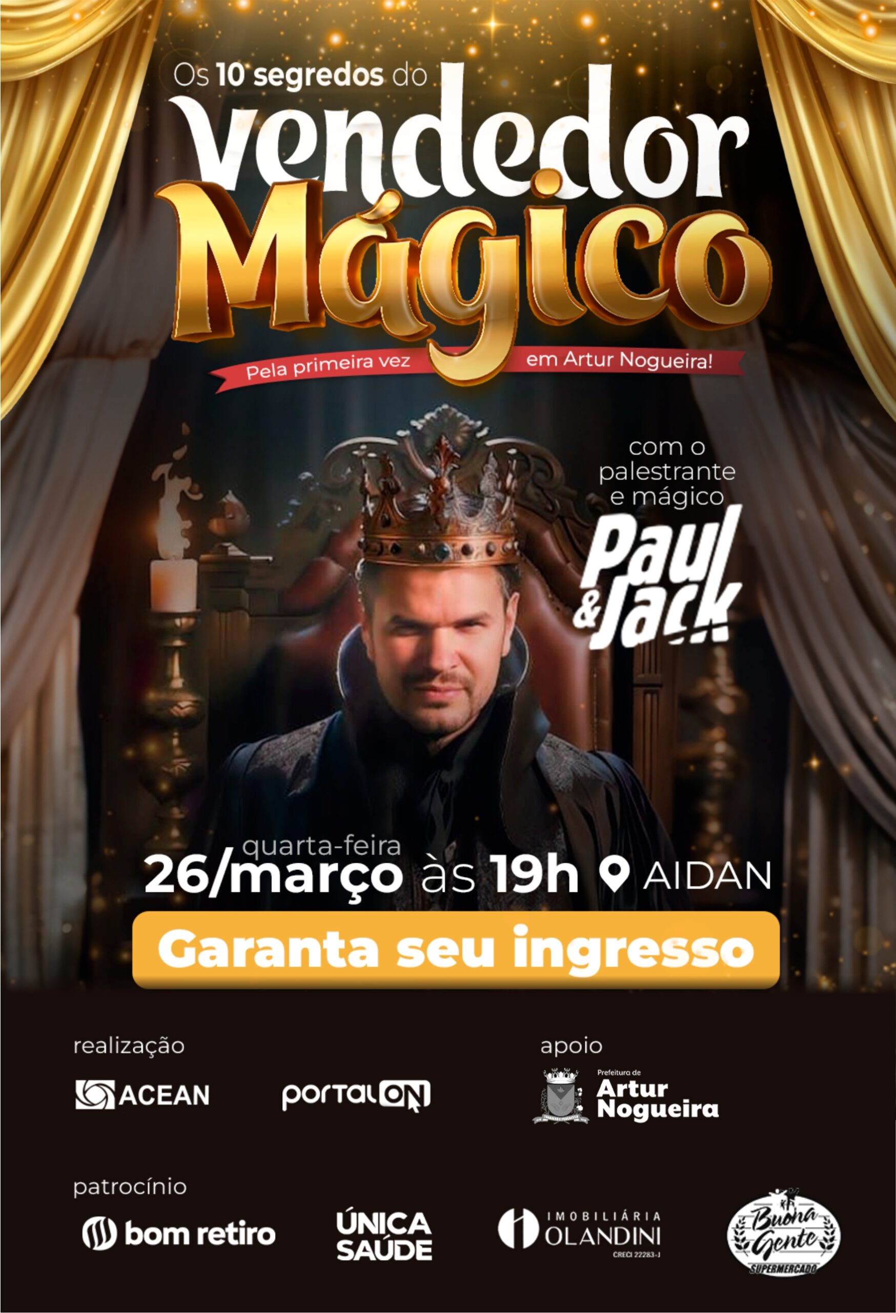 A cidade de Artur Nogueira será palco da palestra “Os 10 Segredos do Vendedor Mágico”, ministrada pelo palestrante e mágico Paul & Jack. O evento está marcado para o dia 26 de março, às 19h, na AIDAN, e promete unir técnicas de vendas e entretenimento em uma experiência diferenciada.